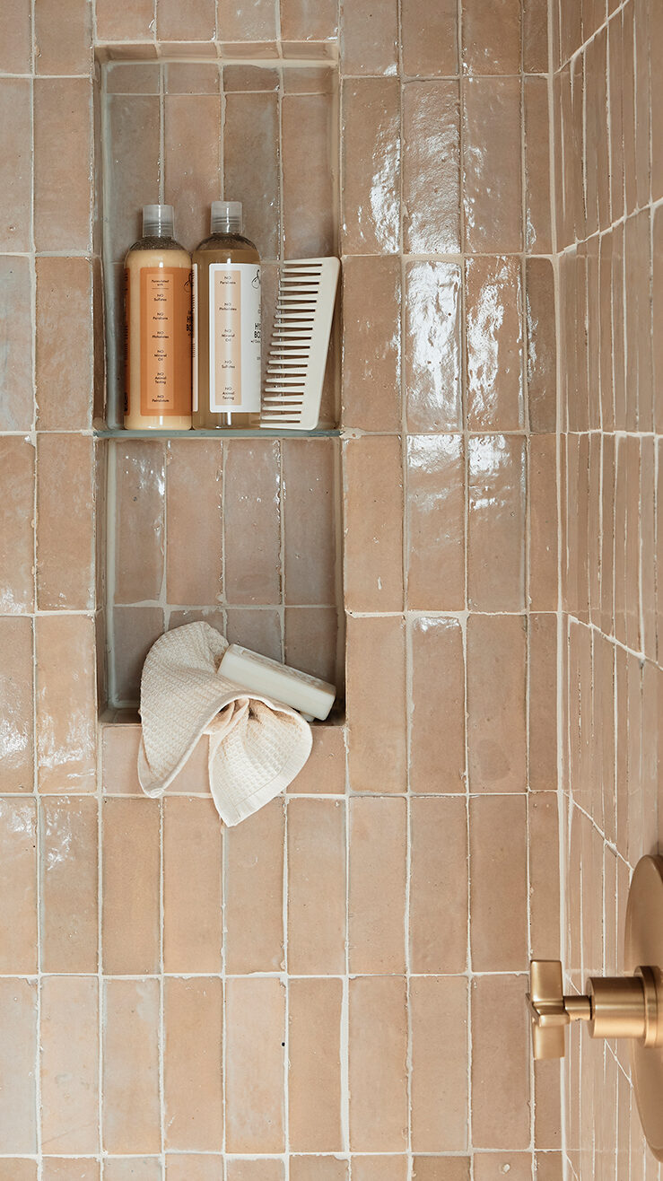 The first-floor bathroom had to be able to stand up to little ones running in and out, flinging wet swimsuits around, and coming in with sandy feet. That’s why Bennert viewed it as a wet room of sorts and clad all the walls in zellige tile. “You don’t have to worry about it so much,” he explains.
