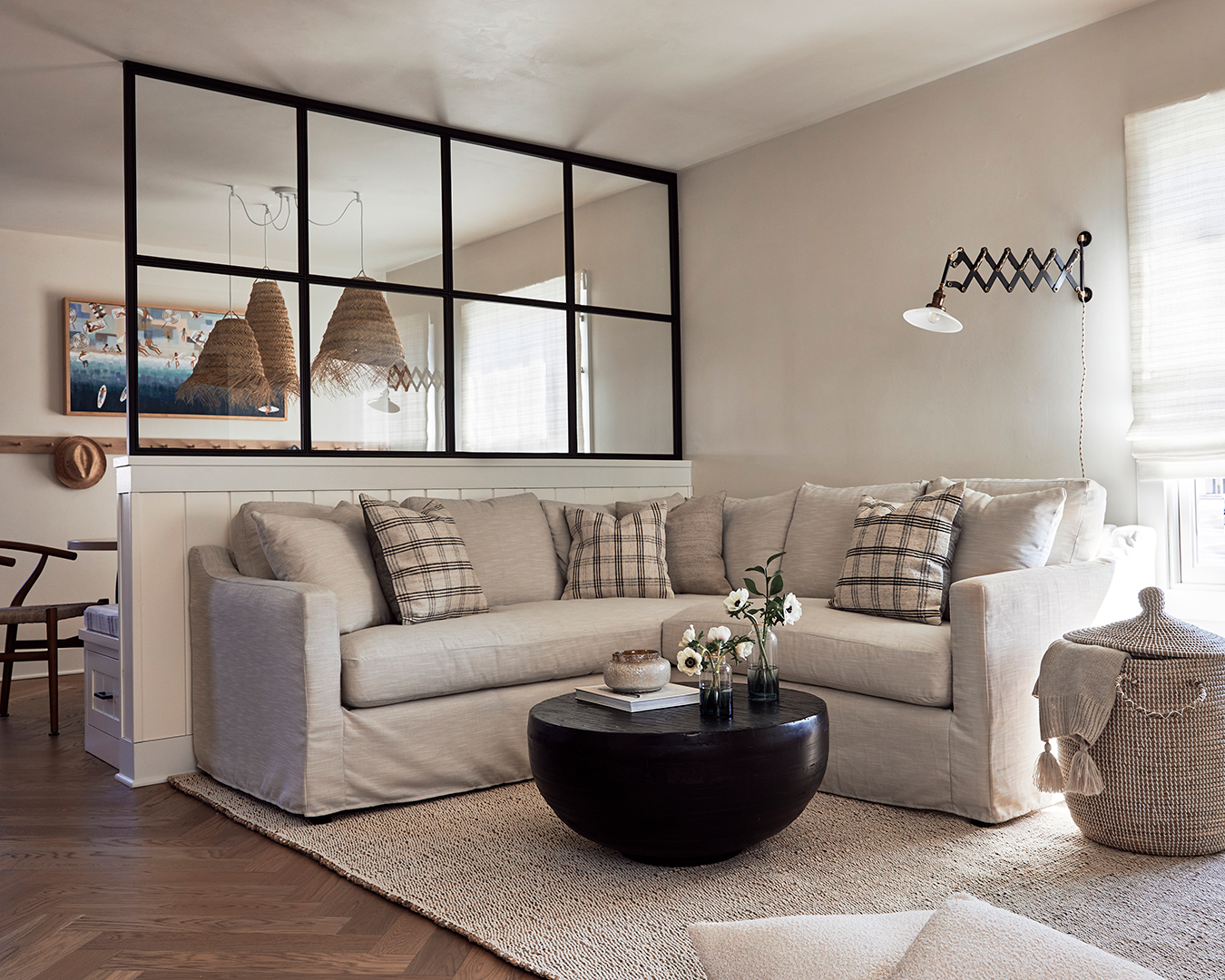 The closest the designers got to incorporating seafaring touches into this beach home was with the new limestone bathroom floors, which have bits of shell remnants in them, and the dark blue range. Instead, their organic take on the theme shows up in the form of seagrass inserts on some of the kitchen cabinets.