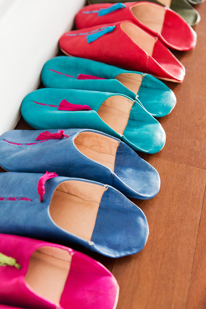 The slippers we bought in a market in Morocco – we host big Shabbat dinners a lot and everyone always ends up taking off their shoes when they walk in from the gritty Brooklyn streets, so I wanted to have a fun, cozy, and colorful option for people. It’s kind of like the uniform or costume you put on when you enter to emerge into the experience.