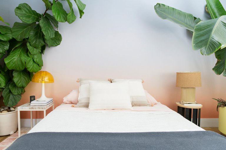 My husband and I love to travel, so we wanted to bring in the energy of some of our favorite places – Morocco, Los Angeles, Mexico City – to build our little oasis, and that means color! I am drawn towards cool colors that feel oceanic, hence the Cookie Monster-blue, Moroccan rug in the living room, and the deep teal wall paint in the dining room. For our bedroom, we wanted to capture a bit of our newfound love affair with the desert, after our Palm Springs wedding, so we chose a dusty “Adobe” for the bedroom wall. I like how soft and serene it feels.