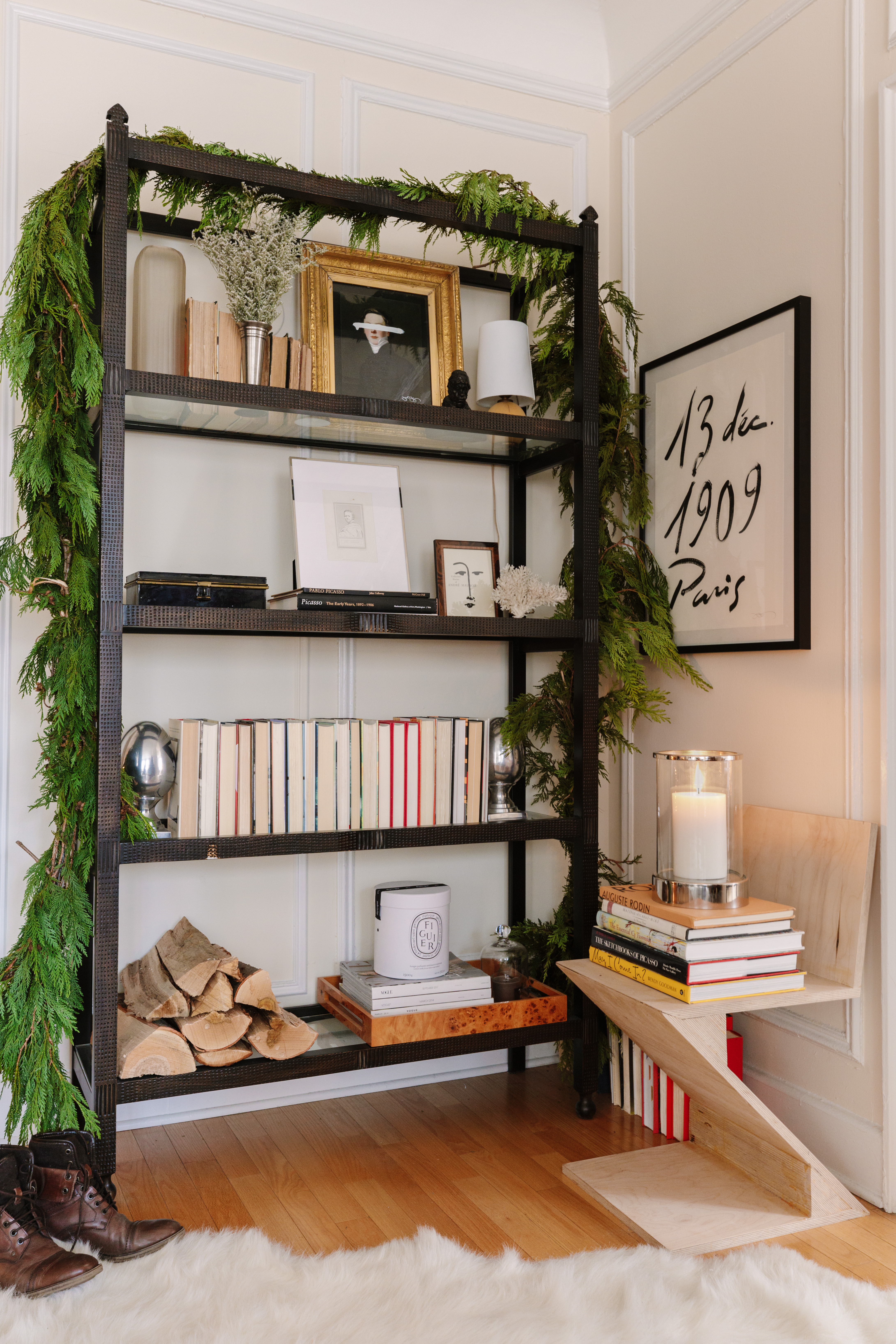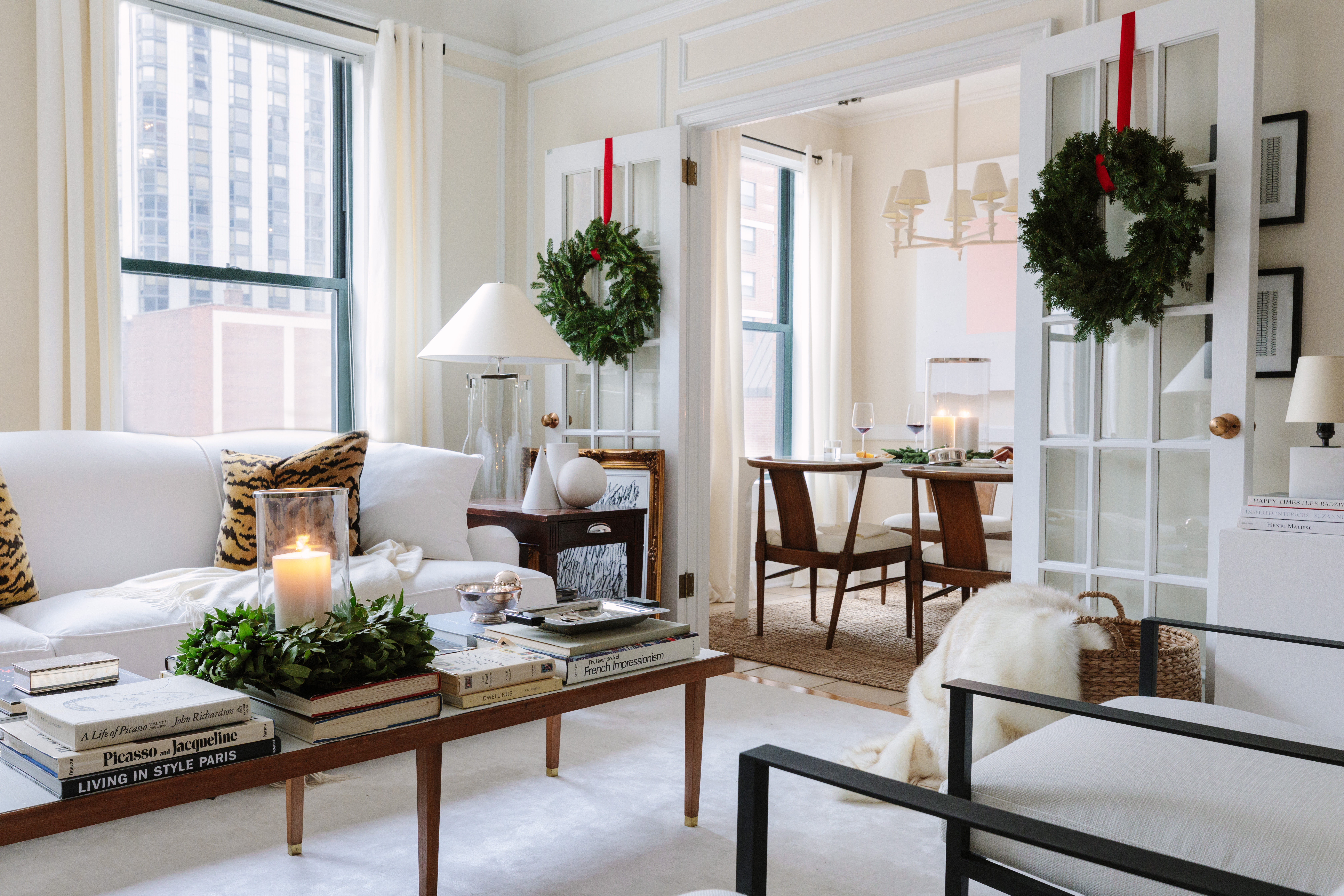 I use real greenery because I love the smell, and it brings a very natural vibe to the apartment. For the most part, it looks beautiful as is. Our bay leaf wreaths above the mantel in the living room and the studio just have simple red ribbons—no huge bows, no ornaments, nothing elaborate.