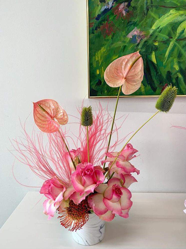 Our favorite florists have been experimenting with this bloom for some time now; it’s otherworldly shape and waxy surface lend itself to creativity. (Kate Esslemont, cofounder of Sir Botanical, is a big fan of coating the blossoms with metallic spray paint, while Busy Philipps’s go-to L.A. floral designer, Under New MGMT, bedazzles them with stick-on jewels.) Gerber chose to adorn her arrangement with a bent metal figure from Ratajkowski’s fashion label, Inamorata.