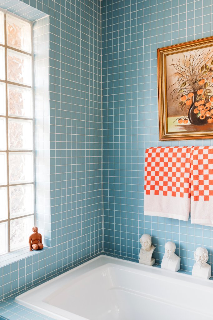 In the primary bath, the team went bolder still. Powder blue subway tile covers three of the four walls, and a burnt orange vanity (painted in Navajo Red by Benjamin Moore, to be precise) only makes the color pop more. Even the marble counter has a not-so-subtle navy and orange veining, two more opposite hues hard at work.