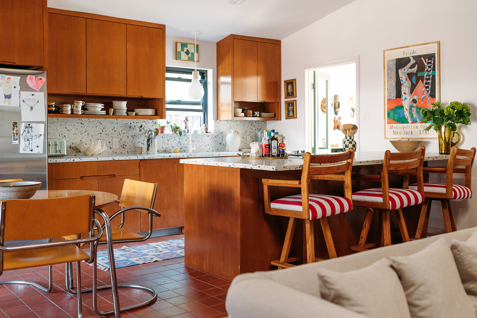 Coffee’s passion for original details doesn’t extend to dated kitchen appliances, though. Local designer Sara Garza lent her skills to the space’s renovation in exchange for a branding refresh. The women leaned into the mod energy of the house, keeping Italian mid-century elements at the center of their mood boards. The cabinets are dark wood with sleek, inset grooves instead of hardware, with open shelves built into the bottoms. Red-striped barstools, one of Coffee’s many vintage treasures, are sturdy enough for her toddlers to climb onto for breakfast at the white terrazzo countertop.