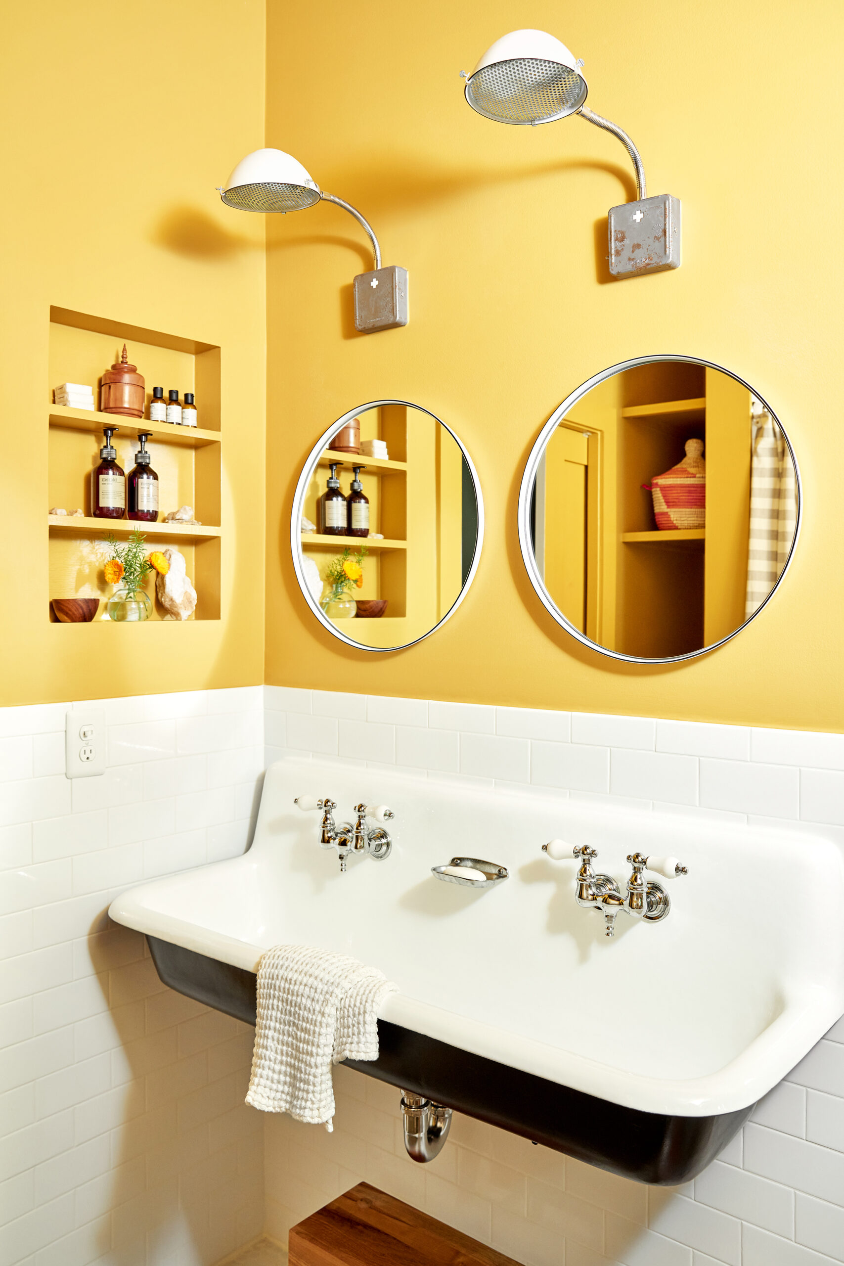 In fact, natural elements were the main source of inspiration for nearly every piece of furniture or fabric the pair sourced, whether it was the rattan sconces or a dialed-back paint palette. “She’s a bit cool, transitional, historic,” Sharif says of Amy’s style, noting that it took a few tries to find just the right style. The designers landed on a modern retreat–meets–cozy mountain cabin look in the end, selecting plaids and leathers that would wear well over time; a wood stove; stone wall hooks; and a farm sink in the mustard yellow bathroom. Livable comfort was really what Hayes and Sharif were going for—and with groups of fishermen traipsing through the house in waders, or children returning from a day spent in old-growth woods and swinging above the water, it’s what the tranquil hideaway was calling for.