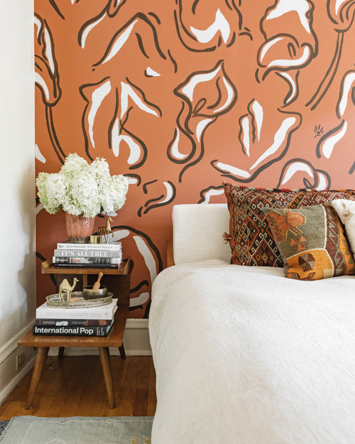 While we definitely find ourselves partial to the terra-cotta hue of the original pattern, the black-and-white rendition of the print depicted in this stunning bedroom makes a compelling case for monochrome living.