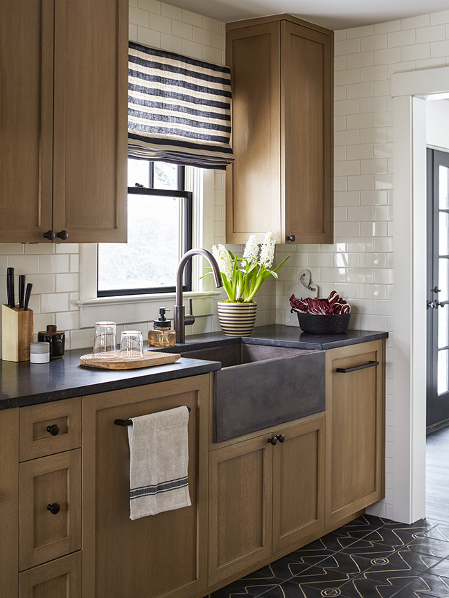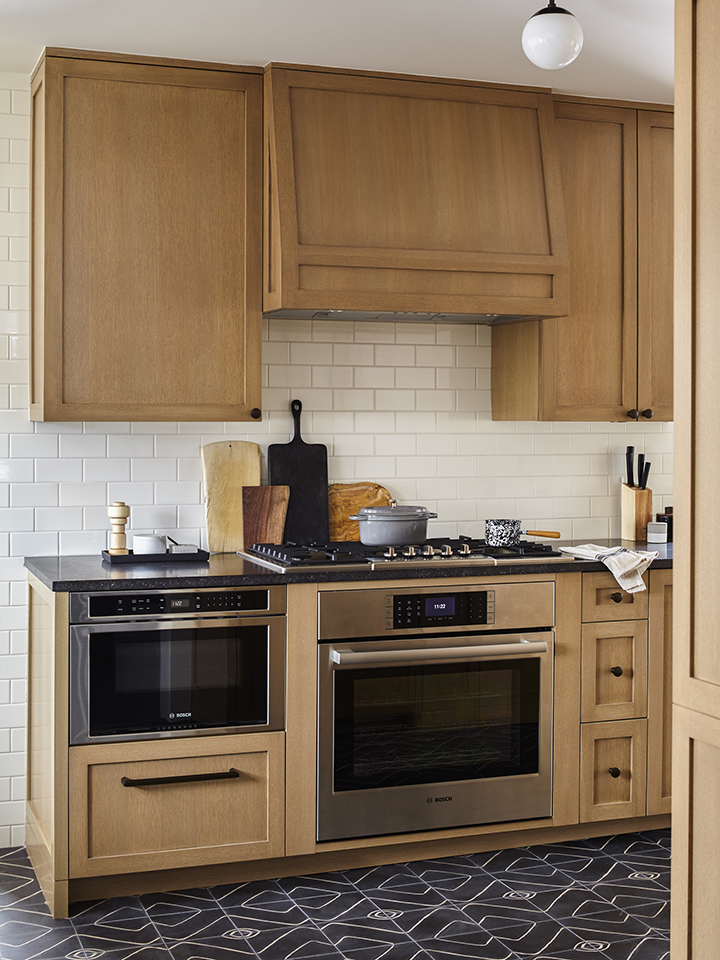 “I knew by keeping the cabinetry and walls light in color that the dark surfaces would not make the kitchen feel dark overall,” explains Hernandez. She chose wheat-hued oak to seamlessly integrate the Bosch appliances and glossy milk-white
