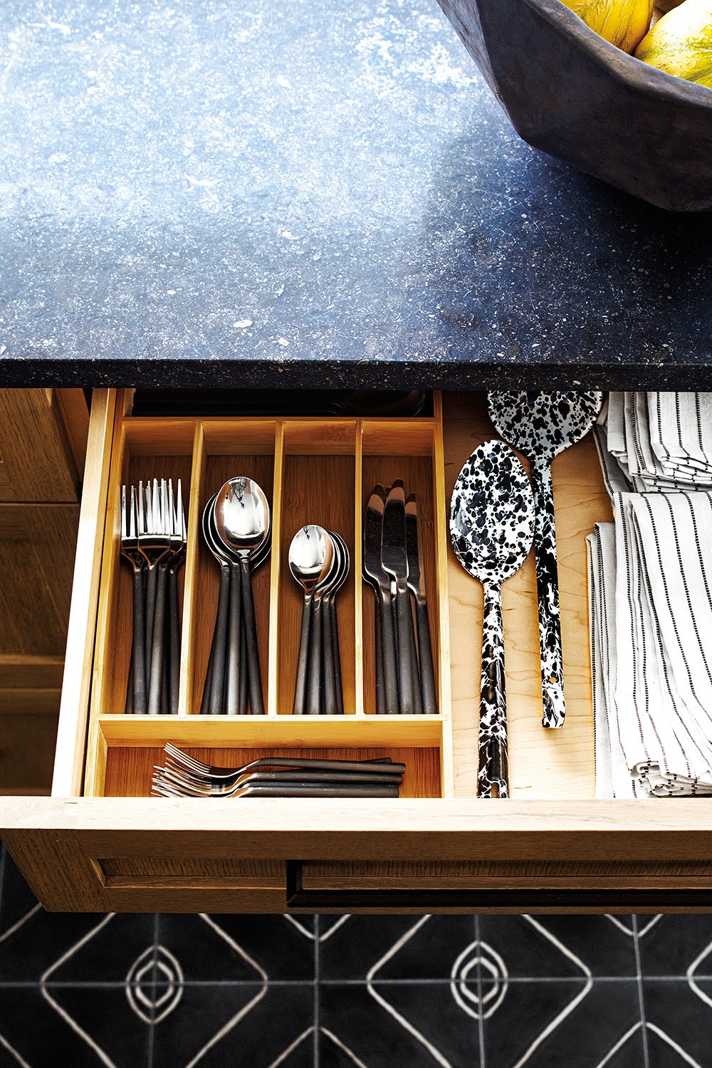 Smaller details, such as the forged steel cutlery, ebony ceramics, and black-rimmed baskets, complement the sparse palette. “The accessories have a utilitarian vibe but are still chic enough to set out for a dinner party,” says Hernandez.