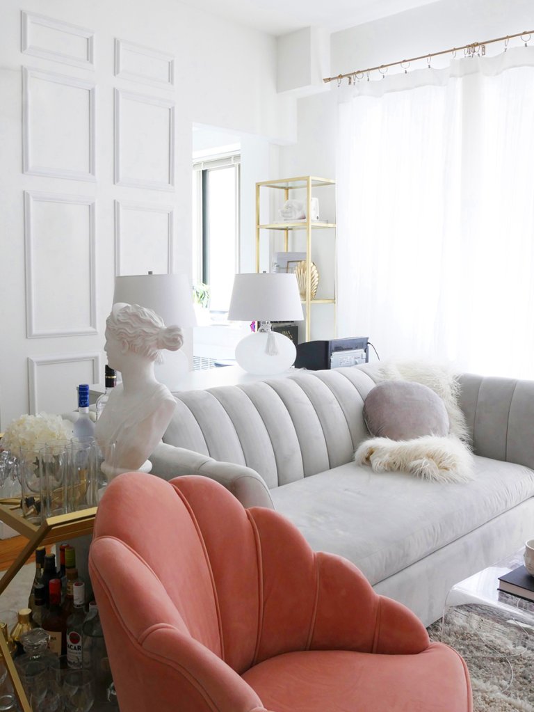 She adds, “When I’m in my living room, I want it to feel serene, with pops of color. But you don’t really learn something like that until you live it.” In this apartment, her couch is a soothing white canvas for lots of greenery and an amber throw blanket.