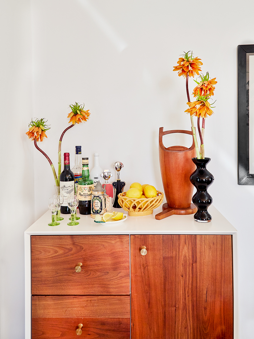 But that’s not to say you won’t find blooms adorning select shelves and the kitchen table. “I approach flowers differently at home than I do at work,” says Hayes of her apartment-arranging style. “At Popup we have lots of mixed varieties and bouquets, but at home I love using one type of flower. It’s more about elevating a cool vase.” (Hot tip: It’s also an easy and impressive styling tip for deli flower devotees.)