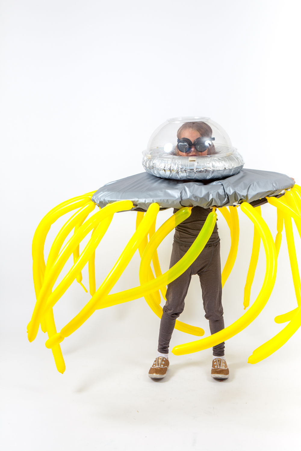 An out-of-this-world UFO costume helps keep other trick-or-treaters light-years away—or just a minimum of six feet. This one by Oh Happy Day is made from a baby spring float (the base of the structure), a gray plastic tablecloth, a small inflatable swim ring, and a large plastic bowl. Taping balloons to the bottom of the structure creates the illusion that they’re soaring through space. If you don’t feel like putting in all the work, consider buying a kit, complete with alien glasses, instead.