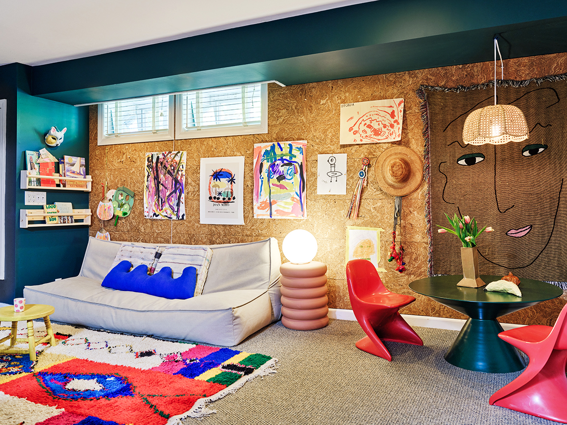 Keeping her future 13-year-old self in mind, Georgia suggested making the basement a coffeehouse-esque hangout over a crafting spot. Instantly Velten-Lattrell pictured a corner bookshelf—the picture books it holds now can easily be swapped out for magazines in a few years. Of course, every lounge needs low-profile seating. The designer opted for a beanbag sofa and paired two vintage plastic chairs from Salvage Style with an Urban Outfitters coffee table. “It’s a little snack station now, but with some more pillows it would be perfect for card games,” she says. Mixing in various light sources that sit or hang at different levels made the room feel less dark and dingy.