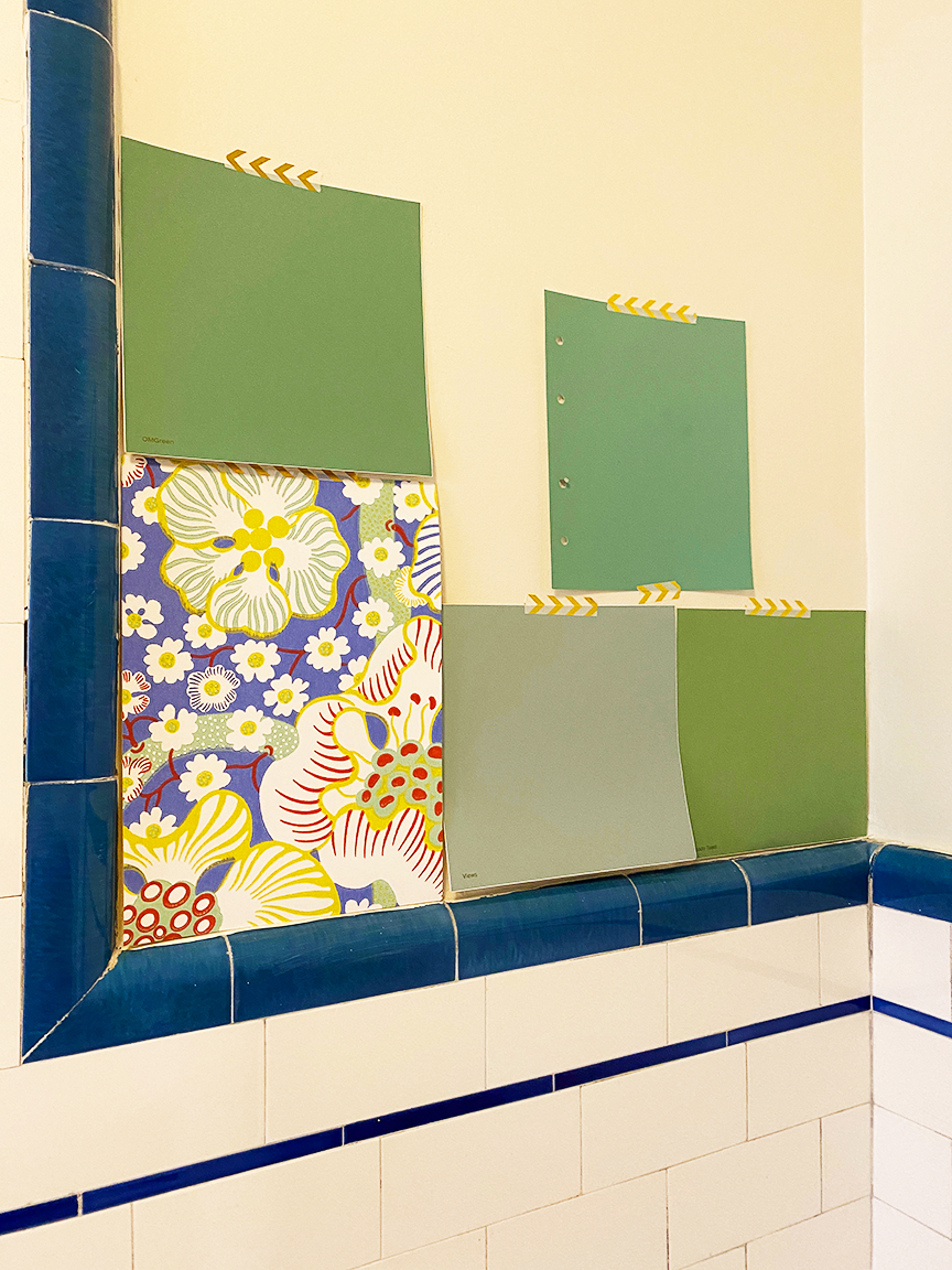 “We created enough of a dizzying effect with the flower and shell shapes that now blue doesn’t feel like the main background,” says the designer of incorporating Clare’s seafoam OMGreen paint on the door and window, a floral Josef Frank wallpaper, printed Velcro sink skirt, and sea urchin sconce.