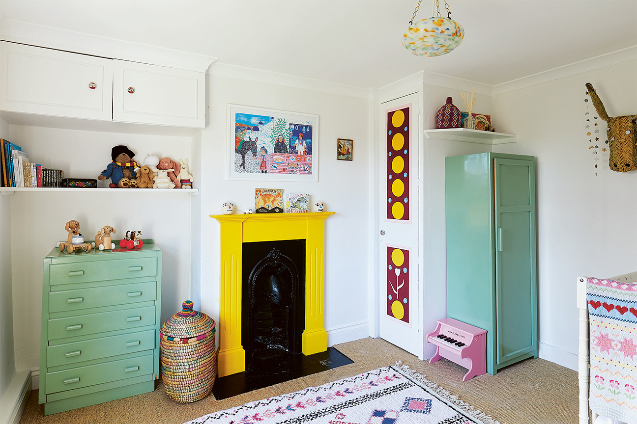 Perkins’s home is filled with color, but the illustrator says she was the most playful while designing her daughter’s room (peep the mint green storage units and bright yellow fireplace). The glass Art Deco pendant lamp, swathed with blue-green and yellow splotches, and the illustration on the closet door tie the bright scheme together.