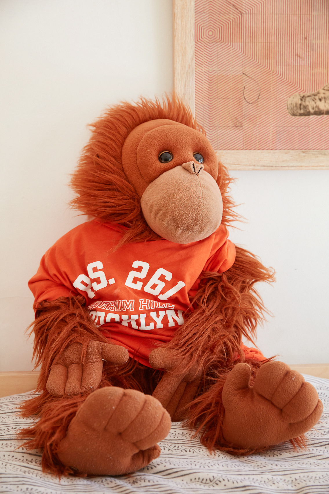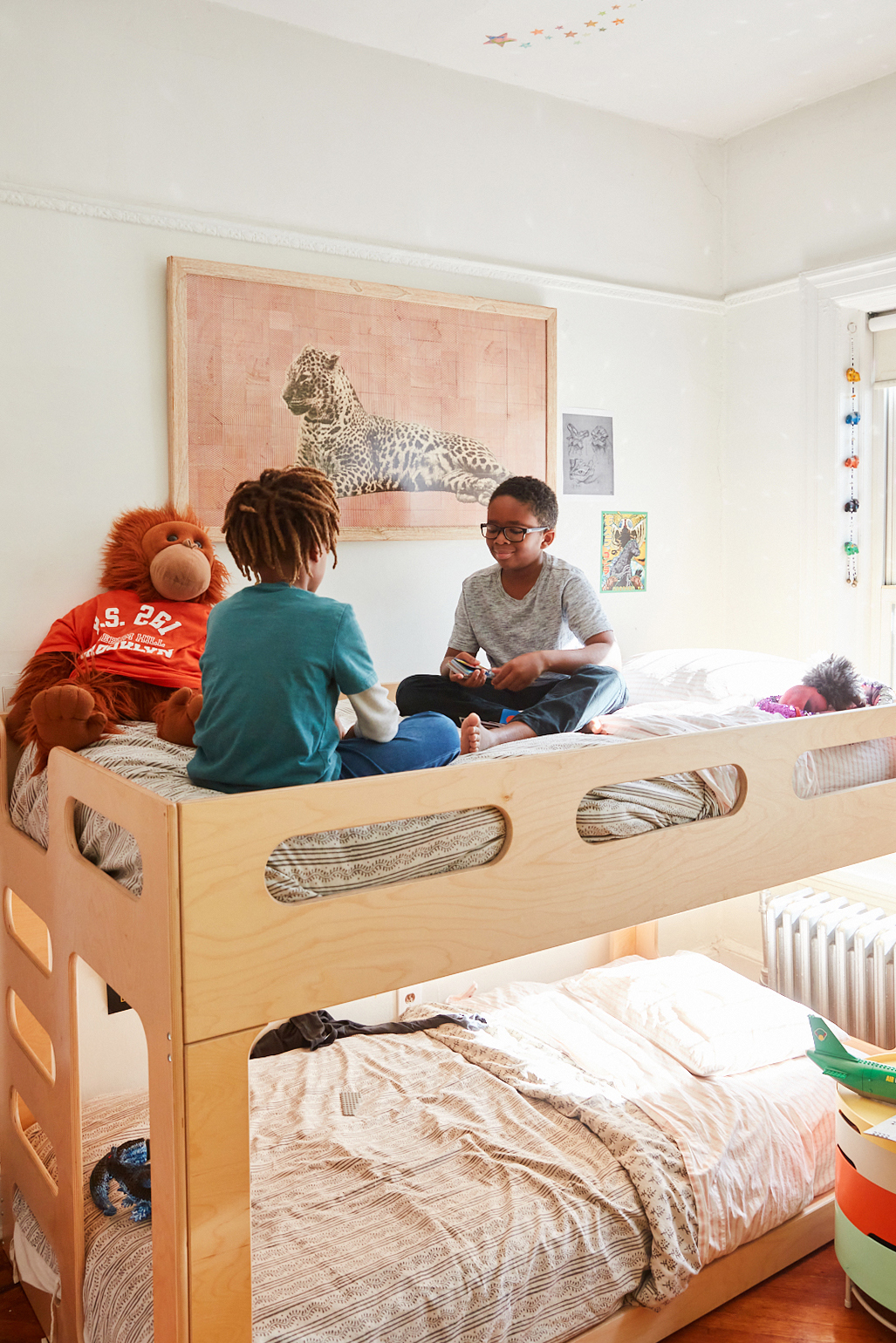 Simon and Xavier both cite their bunk beds as their favorite part about sharing a room. “I always know there is someone up there to keep me company,” says Simon (with Xavier’s stuffies Neptune the sequined snake and Charlie the orangutan also occupying the top bunk, it’s a full house). But when everyone needs some alone time, the furniture piece also carves out personal zones. “Xavier can hang up his Godzilla posters next to his bed and Simon can hang up his skate posters by his,” says Land. “They each feel like they are able to express themselves within their own space without bothering the other one.”