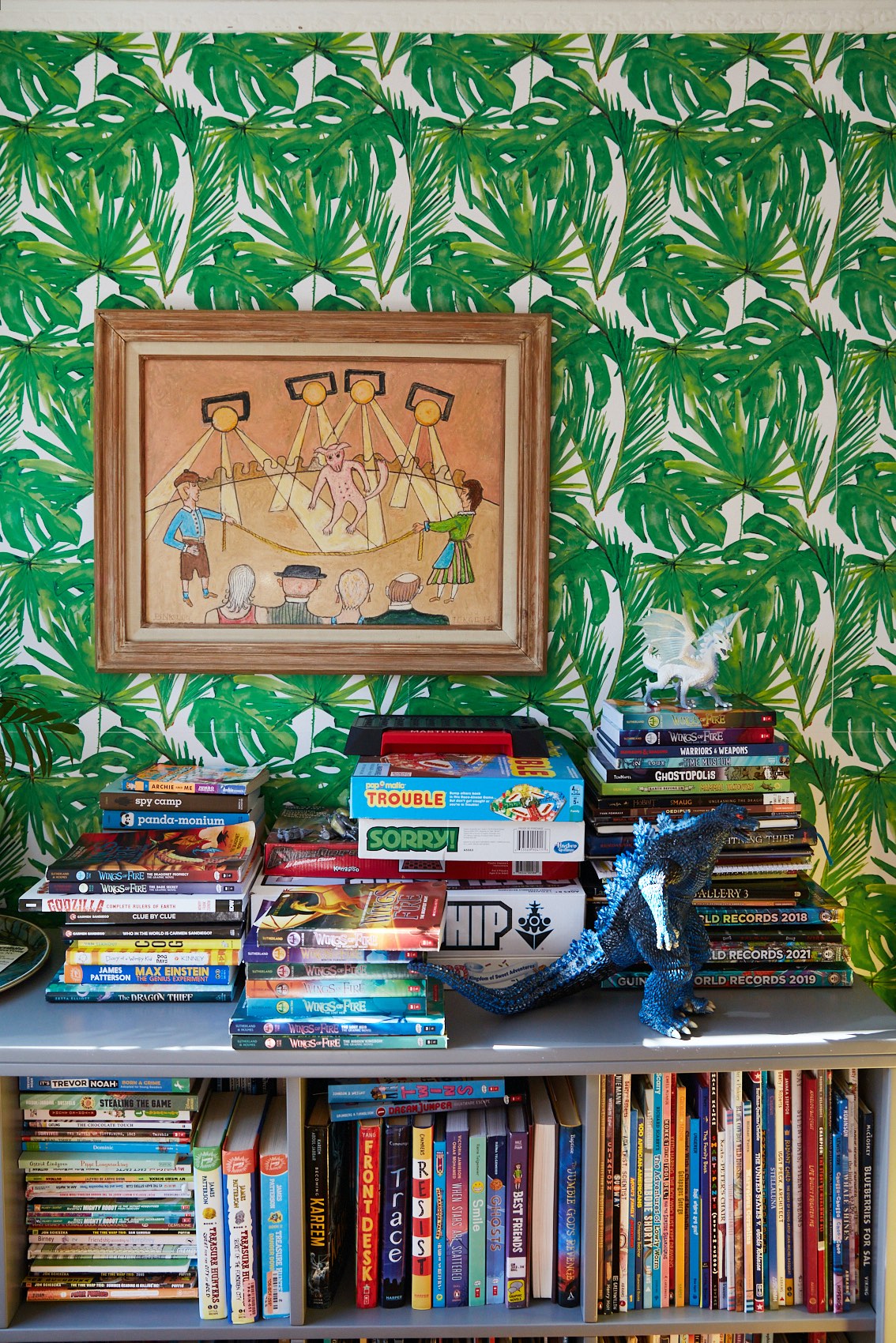 “The dresser was the piece that started the whole room,” says Land. “We picked this great yellow one because the rest of the house has a lot of dark wood, but we wanted the boys’ space to feel really bright and fresh.” Then came the wallpaper. “I’ve always been a huge fan of the Beverly Hills palm print, and this is a more modern version. I really love how graphic it is,” explains Land. The effect is like “entering into a different space outside of our Brooklyn neighborhood and taking a trip to another place with endless possibilities.” One where Godzilla just might roam free. (Psst: For more Kids Rule the House fun, check out the episode here.)