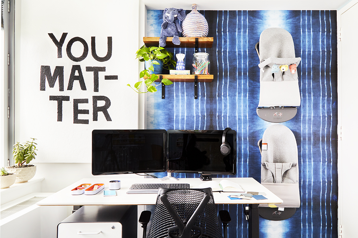One thing Eke decided to splurge on were pieces that would make the office more comfortable: A new standing-sitting desk and an ergonomic chair from Herman Miller help with posture and back pain. As an added bonus, the desk acts as a signal that her work is done. When Eke is finished for the day, she raises it all the way up and tucks the chair beneath. The kids know this means Mommy is all theirs.
