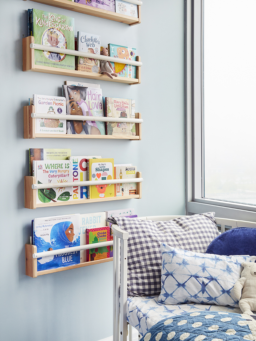 Eke chose IKEA’s Flisat book ledges because they’re a great way to store her children’s books in the tight space (each shelf protrudes just 3 1/2 inches from the wall), but she also had ulterior motives. “I like books, and I want my kids to like books,” she says. With 11 display ledges, Max and Zak are almost guaranteed to grow up to be bookworms, too.