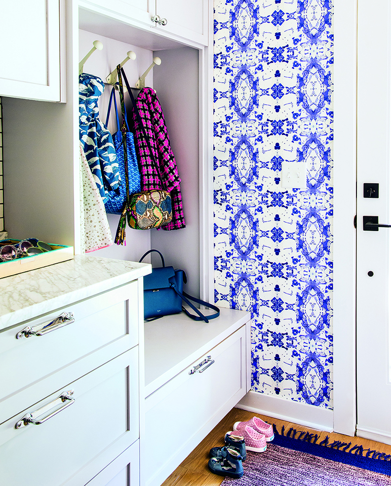 In the mudroom, West applied big-print cobalt wallpaper and added contrasting lilac cabinets, because “laundry rooms need to be a little happy.” Everywhere she points out “something sweet, something graphic, something old, and something new—I layer those elements throughout.”