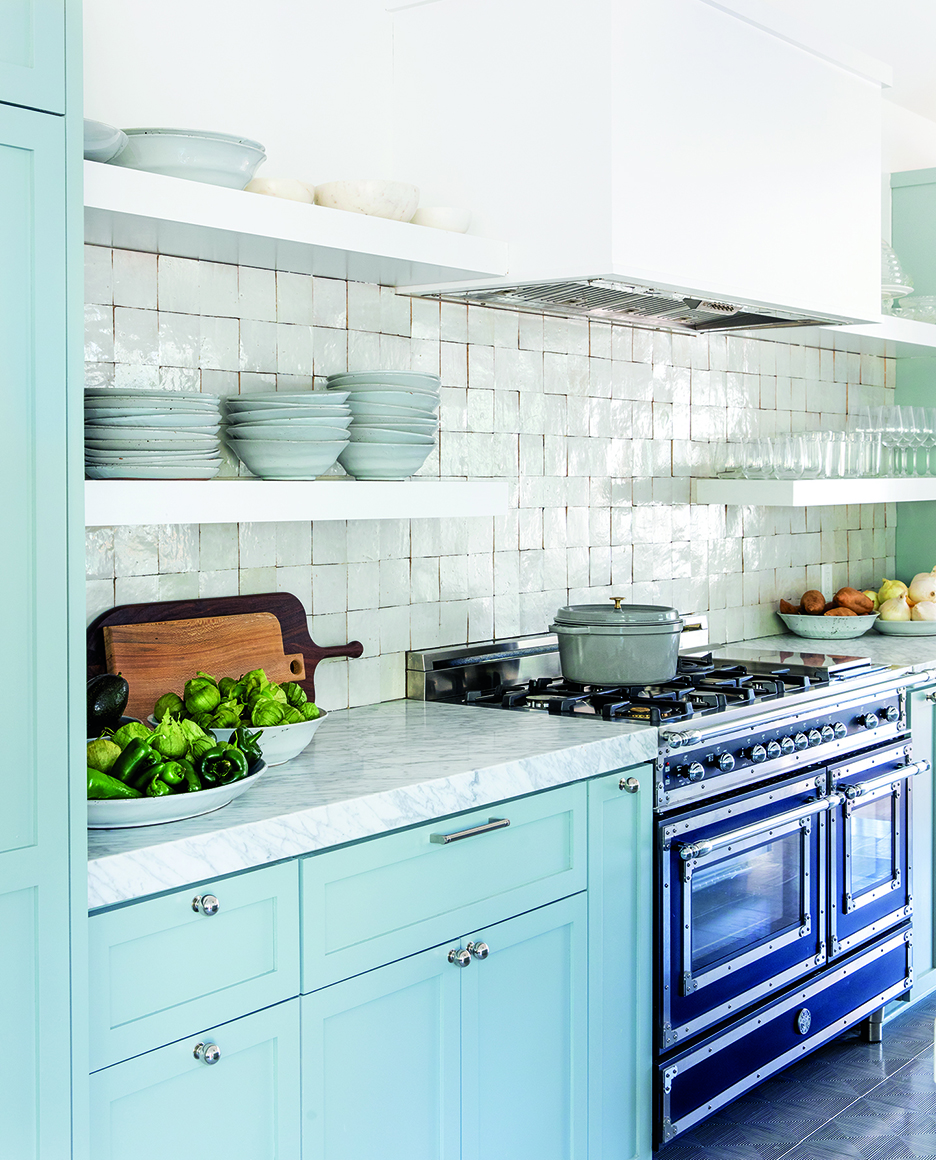 The adjacent kitchen continues the soft neutral theme, with cabinets and barstools painted duck egg green and inset appliances that seamlessly blend in. The