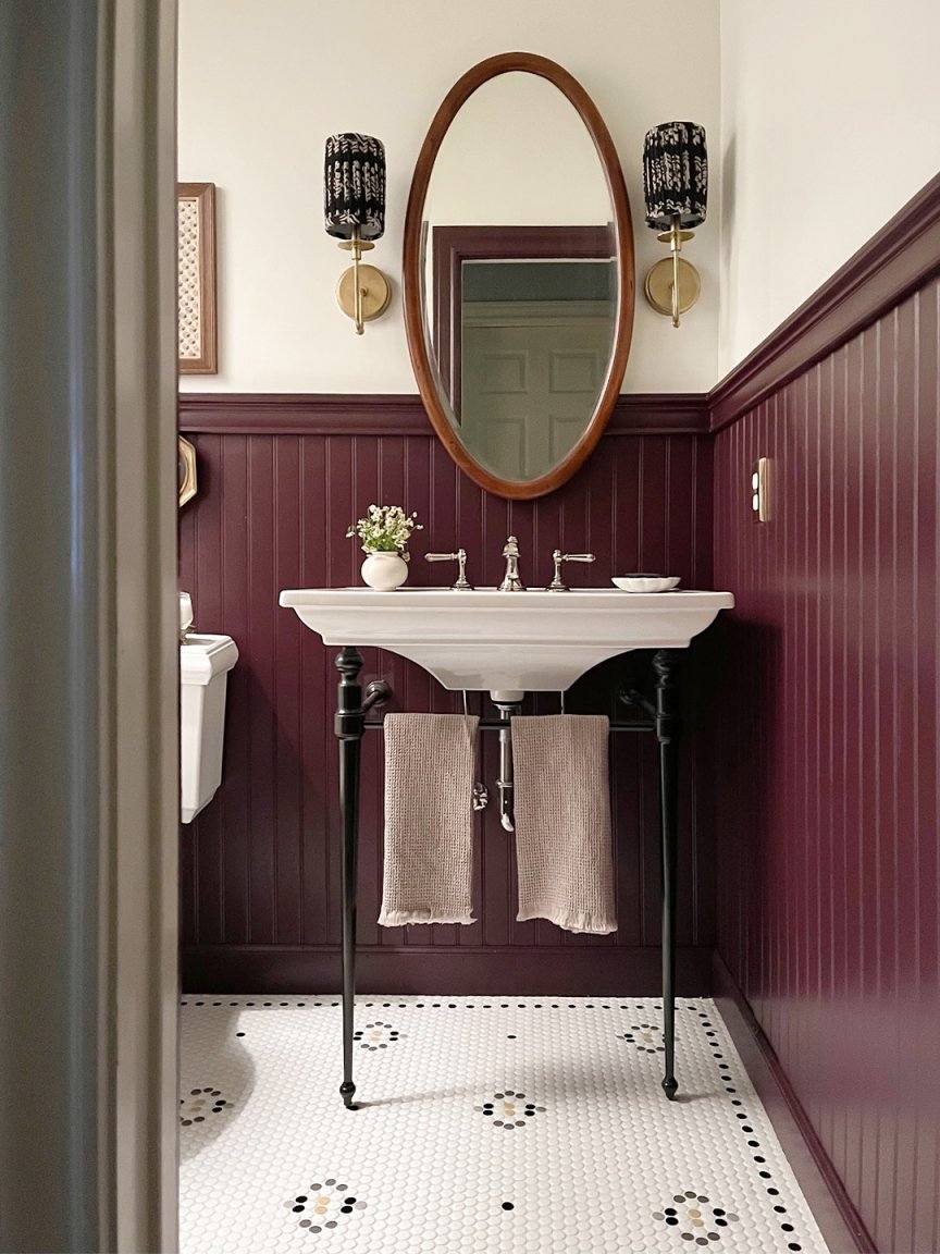 Most of her home is dappled with greens and neutrals, but for this spot, Jose opted for a bold eggplant shade (she color-matched Brinjal by Farrow & Ball) on the chair-rail molding. “I wanted the color to reflect who we are and our heritage,” she explains. “The white walls weren’t doing that.” At first, she was worried the dark hue would contradict all of her hard work to make the tight, windowless space feel larger, but in reality it added depth. Choosing a light-reflecting, high-gloss finish didn’t hurt either. Now the bathroom isn’t just more functional—it’s a tangible interpretation of Jose’s childhood.