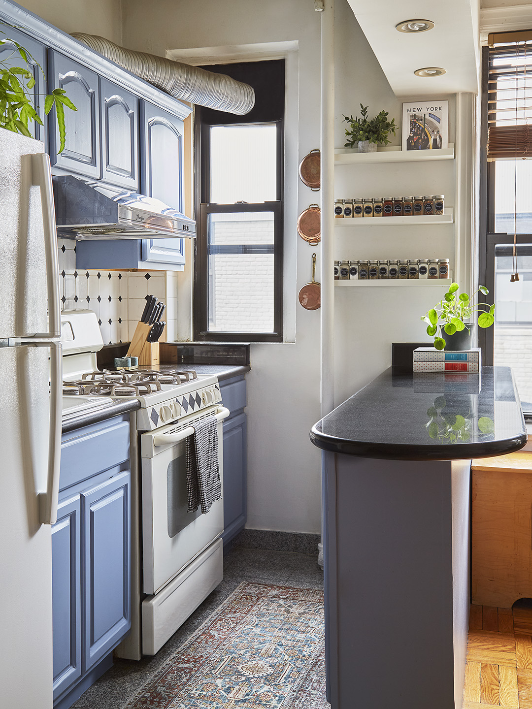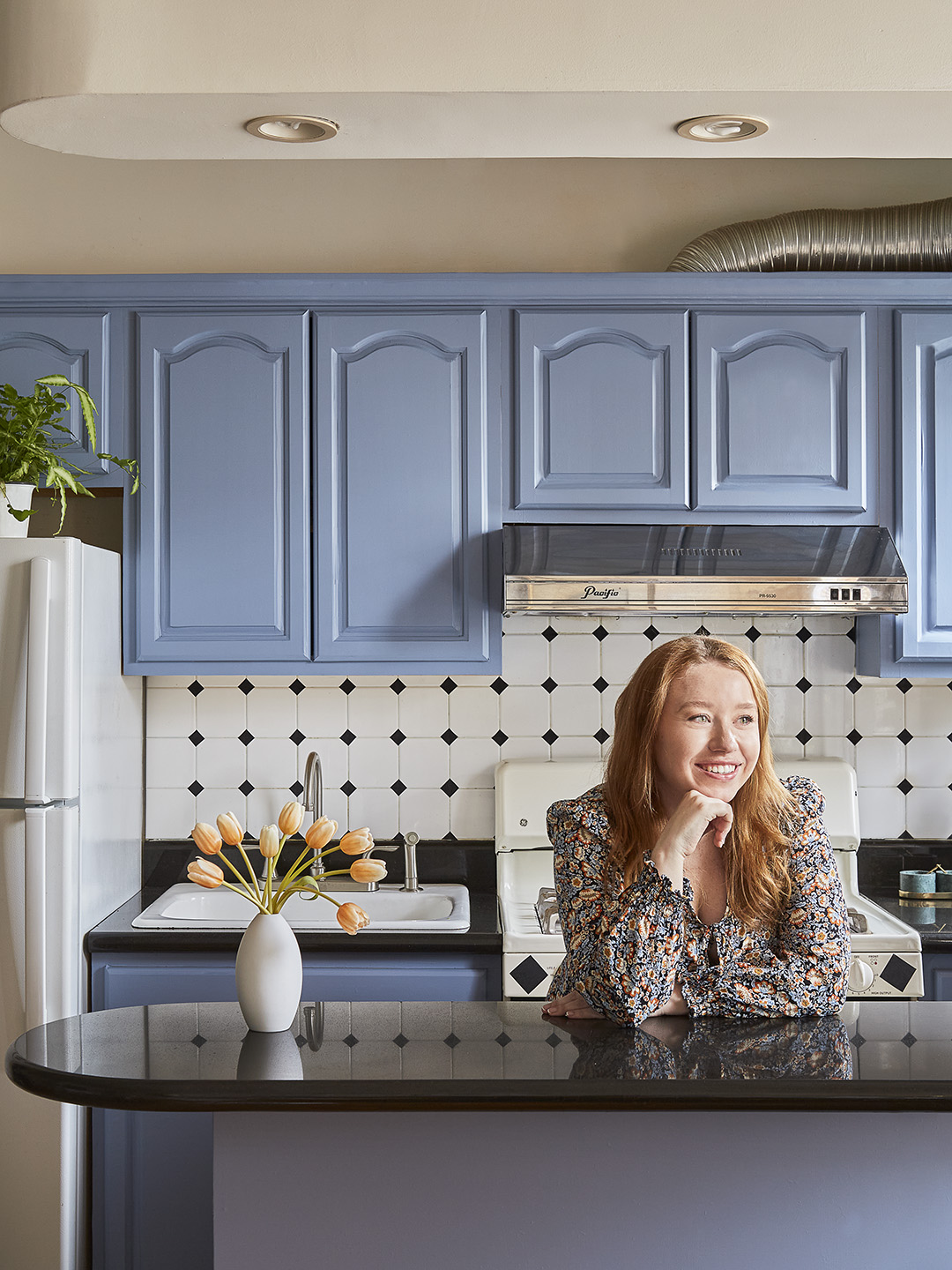 It used to be that if you lived in a rental with dated wood cabinets, there was nothing you could do. You were simply stuck with them. No longer. Madeline Scalzi, a New York–based creative and TikTok-er, found a nonpermanent way around landlords’ restrictions. “I had always wanted blue cabinets, but painting was out of the question,” says Scalzi. Familiar with the trend of covering old countertops in removable vinyl, Scalzi had a lightbulb moment: Why not use contact paper for cabinets?