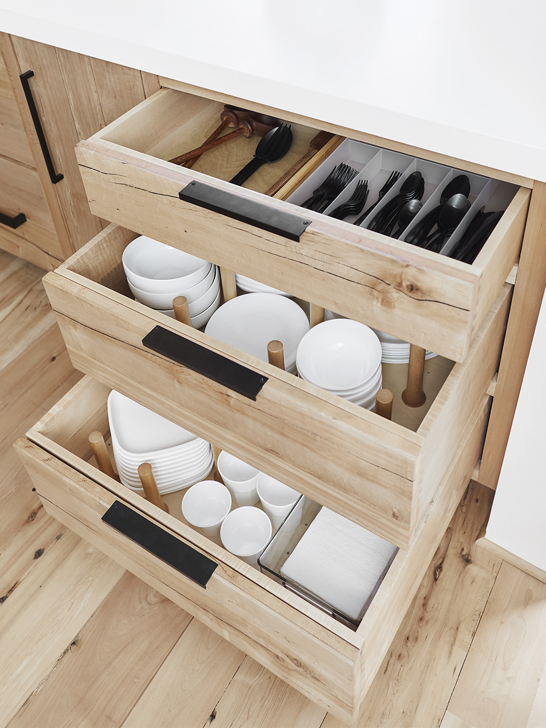 If your kitchen cabinet organization plans lack…well, cabinets, you can still make the most of drawers. Channel Emily Henderson and try a pegboard system. Your bowls and platters will stay firmly put when the compartment slides open, and you can squeeze in a surprisingly large number of items.