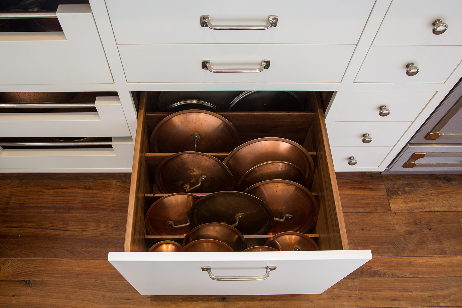 Deep drawers call for stowing away your bulkiest cookware—but take a page from designer Karen Harautuneian’s playbook and stack horizontally, not vertically. Dividers will keep all lids perfectly uniform and easy to grab, so you’ll never again have to use a plate as a makeshift cover to prevent tomato sauce from splattering all over the stovetop. Save yourself the cleaning hassle.