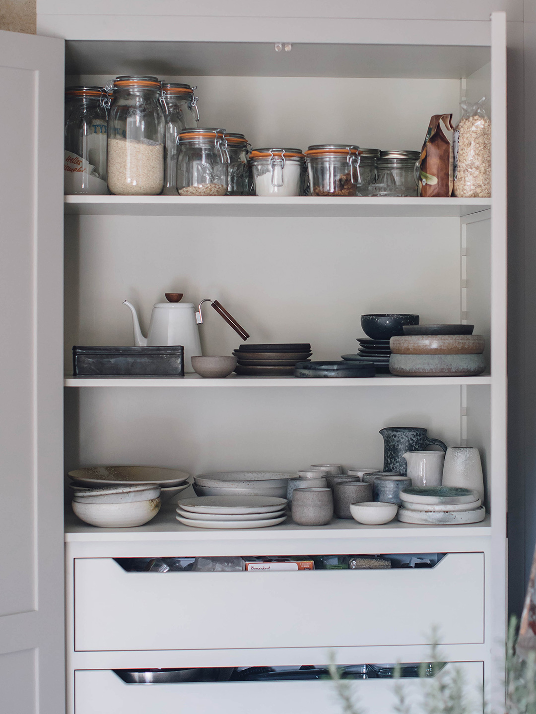 DeVol Kitchens has the right idea with decanting dried goods into matching canisters. Not only does this cut down on visual clutter, but if you pick see-through containers, you can quickly check when you’re running low on things like flour and oats (and amend shopping lists accordingly). If you have the ability to renovate and are starting from scratch, consider creating a unit that also includes drawers. You can use them to hide away smaller items that might otherwise get lost in the back of a shelf.