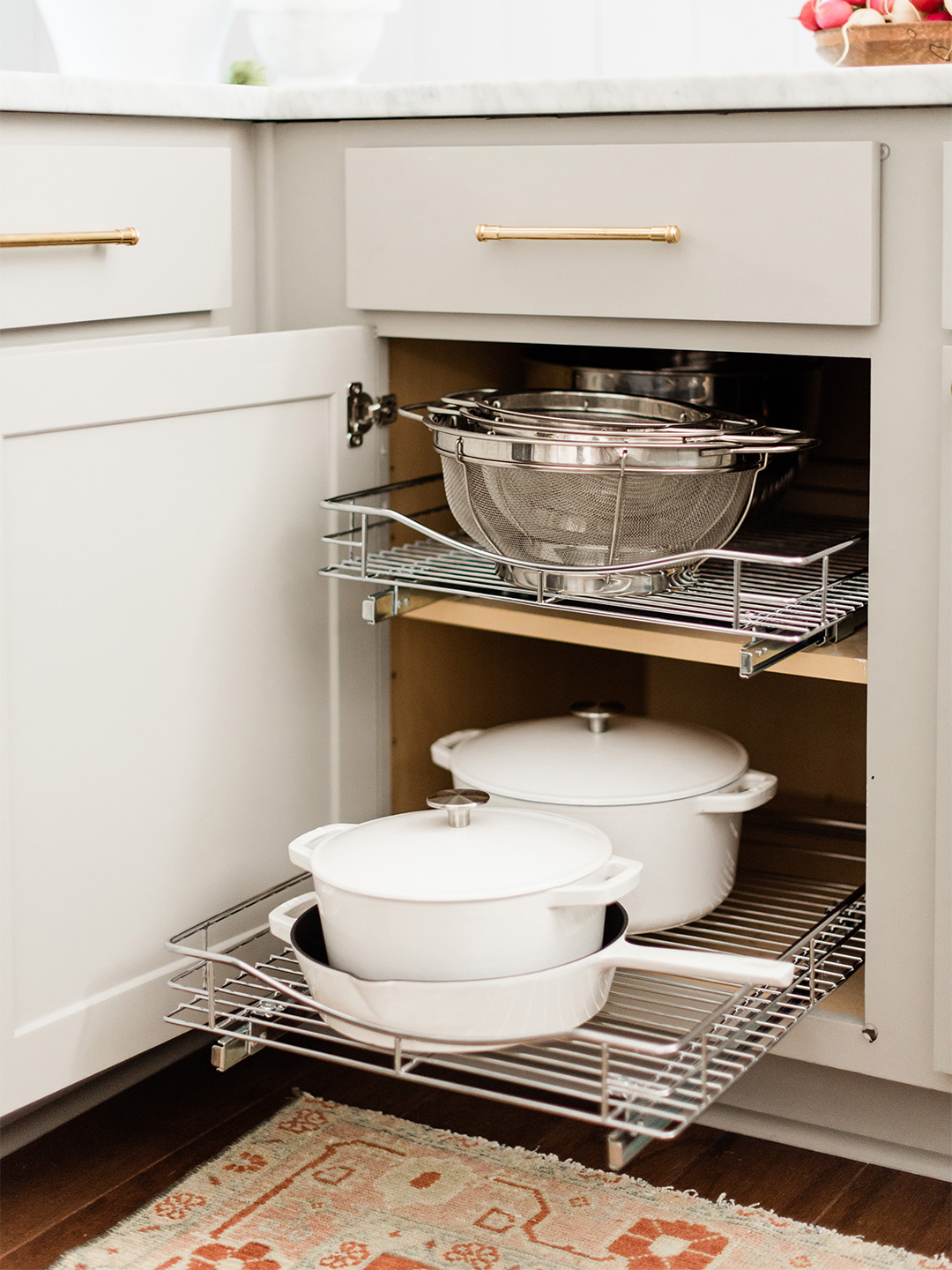 One of the best things pro organizer Shira Gill did for her client’s kitchen was install a rolling rack in the lower cabinetry. She relegated heavy Dutch ovens to the bottom shelf and arranged lighter items on the top, so you don’t risk any enamel pieces getting nicked by being shoved in a pile together.