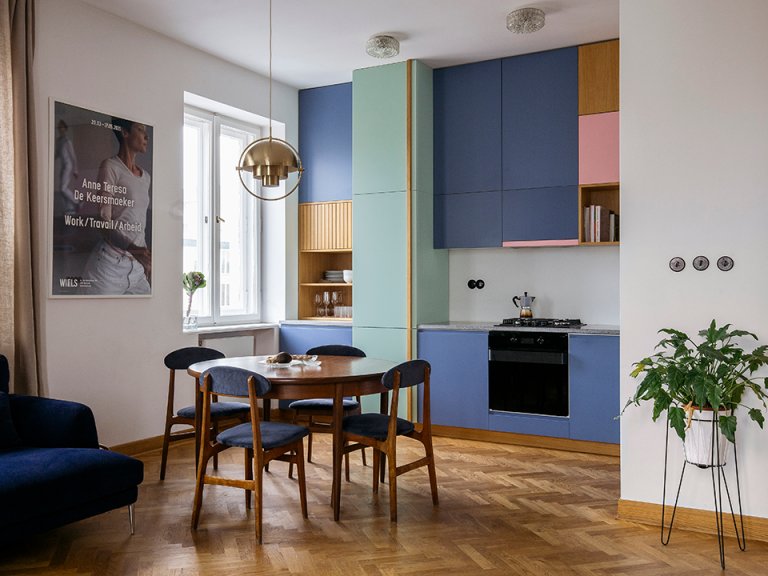 Plate racks are an ingenious way to keep your dinnerware within grabbing range and avoid chipping your novelty thrift store treasures in the process. Plus, if you have glass-front doors, propping them all up means you can see more of your multicolored dishes—group them by color for maximum effect. Here, DeVol Kitchens’s natural-colored wood system nicely balances out the darker blue of the built-ins.