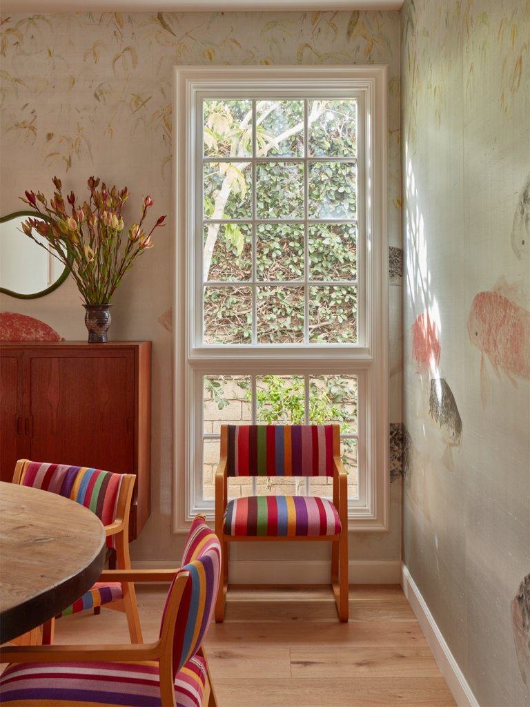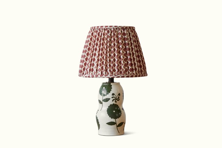 Once used to store rice wine, this vessel—now topped with a sloped linen shade—is a fitting choice for the room.