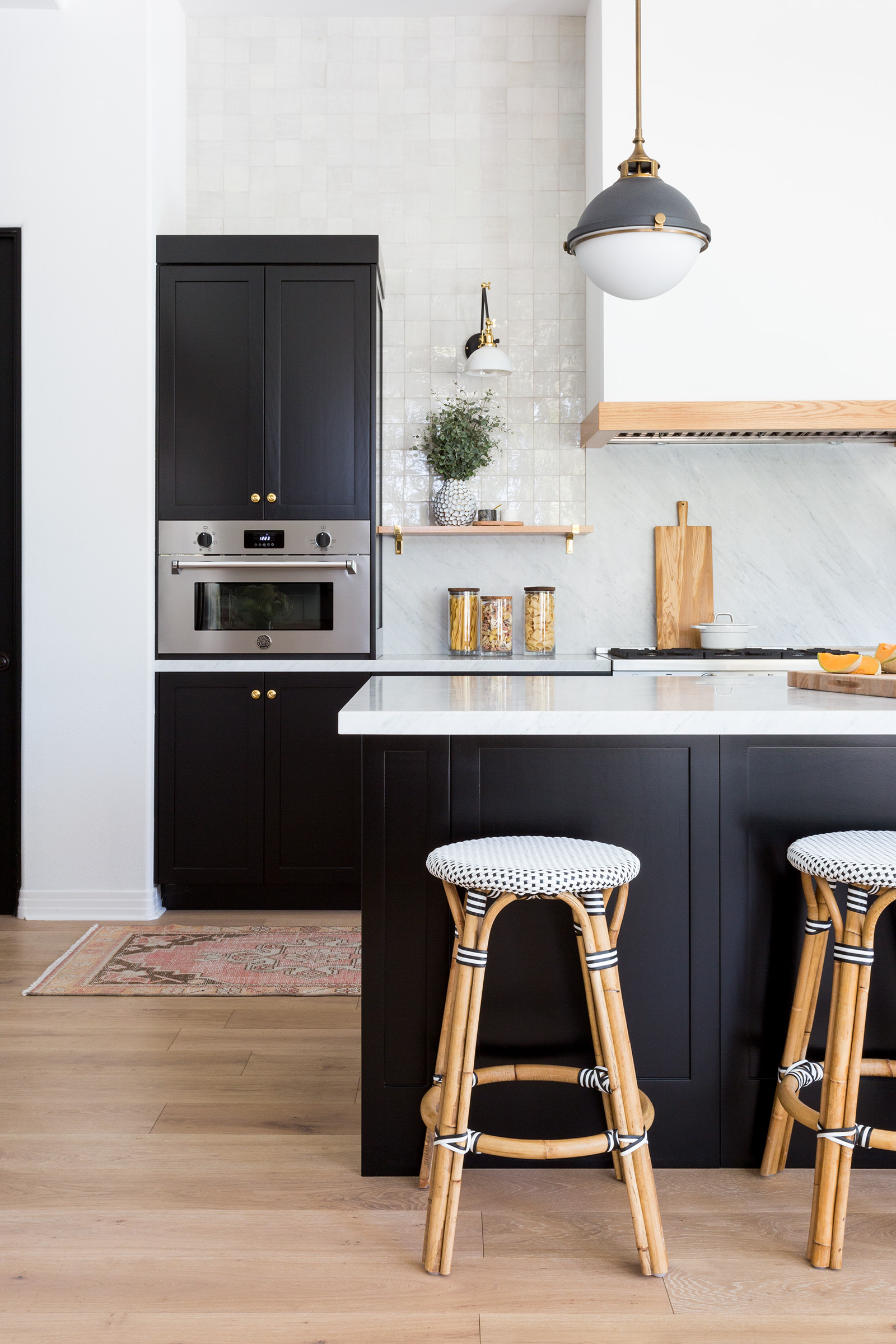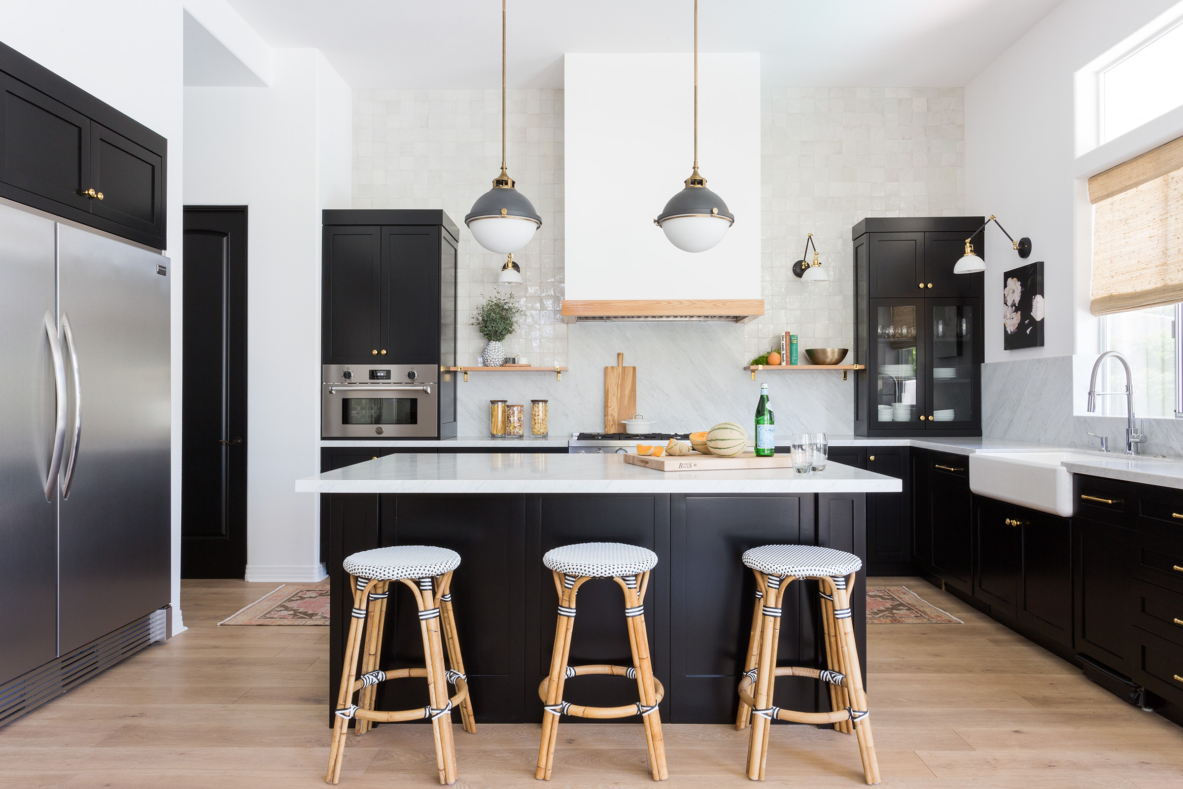 To unite their aesthetics, she went with a contemporary-classic look. She suggested matte black cabinetry with gold pulls, which her parents were into from the get-go, and glazed white zellige tiles, which took a bit more convincing. Nice appliances were a must. “It’s always been my dad’s dream to have a side-by-side full refrigerator and freezer,” says Kurtz. Ultimately, her parents were game for anything she recommended, and they spent those two weeks working together—her dad was the contractor.