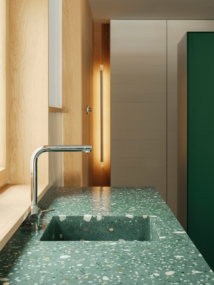 Majorca-based tile maker Huguet handcrafts some of our favorite wash spaces—and terrazzo is its specialty. The waterfall edge of this custom example is perfect for minimalists who want to keep the visual clutter to a minimum.
