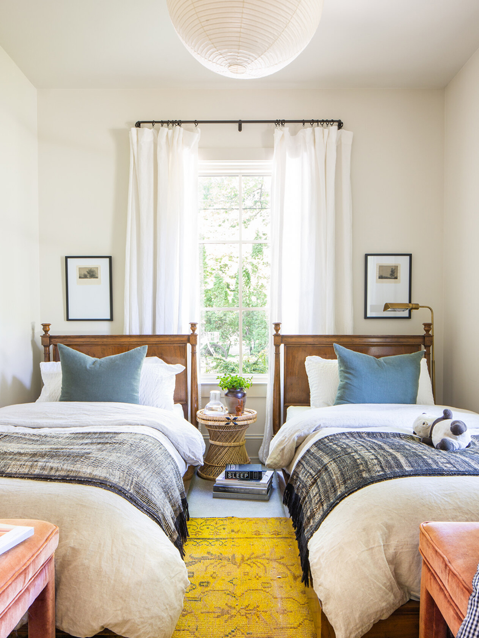 The big challenge with any new build comes after the drywall has been installed: it’s bringing in objects, textures, finishes, and patinas that create interest and a sense of history. Coating much of the interior with Color Atelier’s limewash paint immediately lent depth and age to the space. Duda worked with local artisans to bring more complex design ideas to life, like the white oak kitchen island by Wolf Wood Co. that features open shelves where she can display handmade ceramics. As for furniture, the interior is an expertly curated mix of thrifted pieces. The vintage sofa reupholstered in rust velvet and the Baker twin beds were both Chairish finds, while the pair of Kurt Versen sconces in the living room (her favorite score) was $42 at a local antiques shop. The only new thing in the house is the dining table from Stoffer Home.