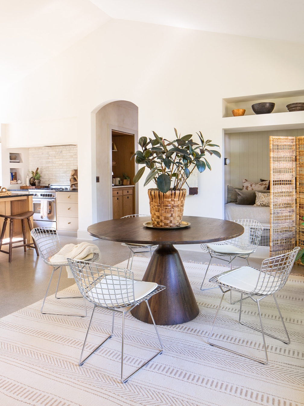 A lot of vacation rentals feel like an afterthought, but Duda designed this home specifically with her guests in mind. “There is so much more to a space than how it looks. There’s the tactile moments, those items you touch throughout the day—light switches, doorknobs, faucets. The details make such a difference,” she explains. Even carving out an arched niche for a plant in the shower makes the otherwise routine spot feel memorable. While custom details like the coffee-bar nook pushed the project over budget, the entire home still came together for under $300,000.