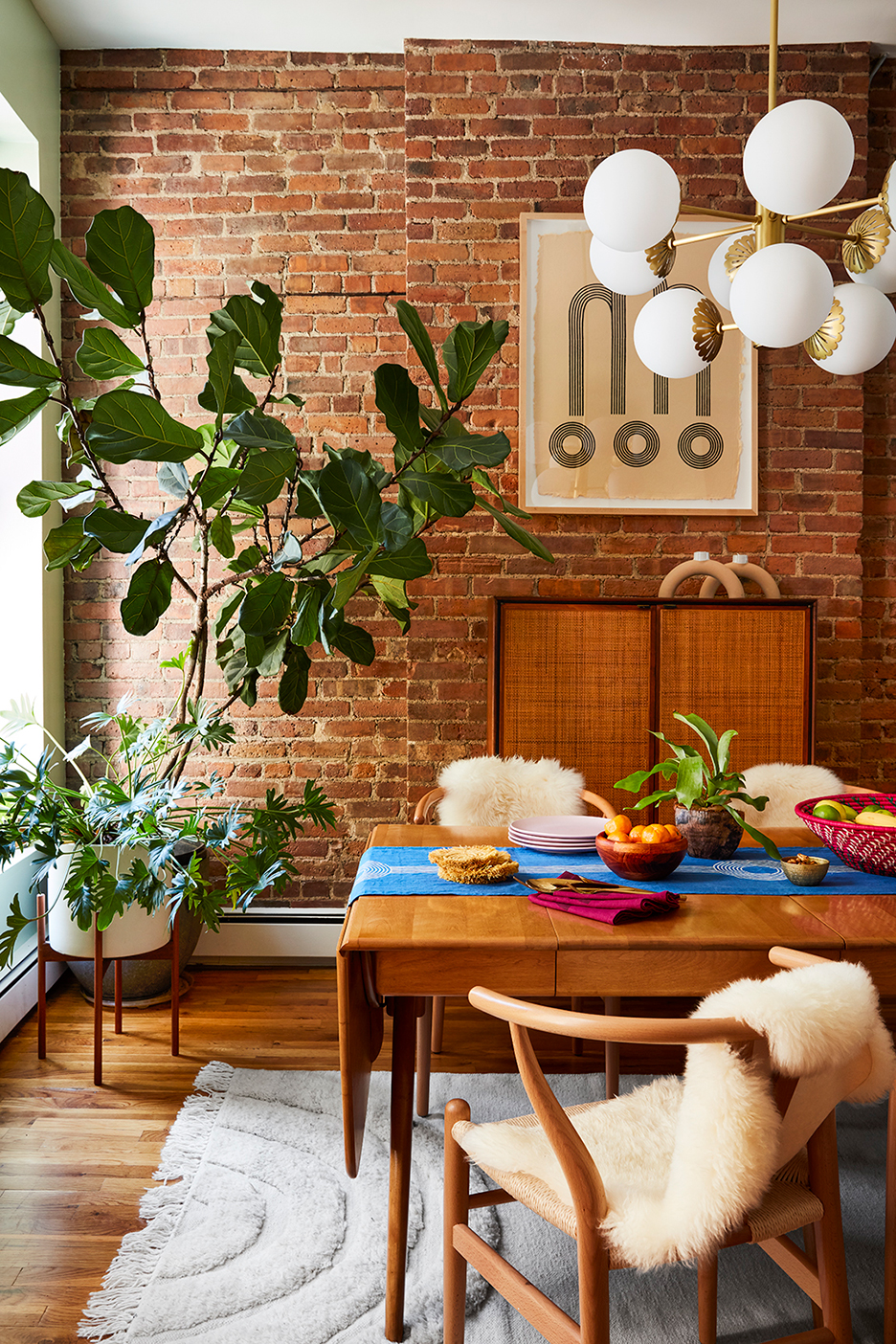 When it came to designing her space, Thomas created a bright, sun-soaked oasis. The four-story townhouse in Brooklyn’s South Williamsburg, where she lives with her fiancé and 17-year-old Fulano (who gets his own zone on the second floor), is filled with sculptural plants, layered nooks, and a rainbow of accents.
