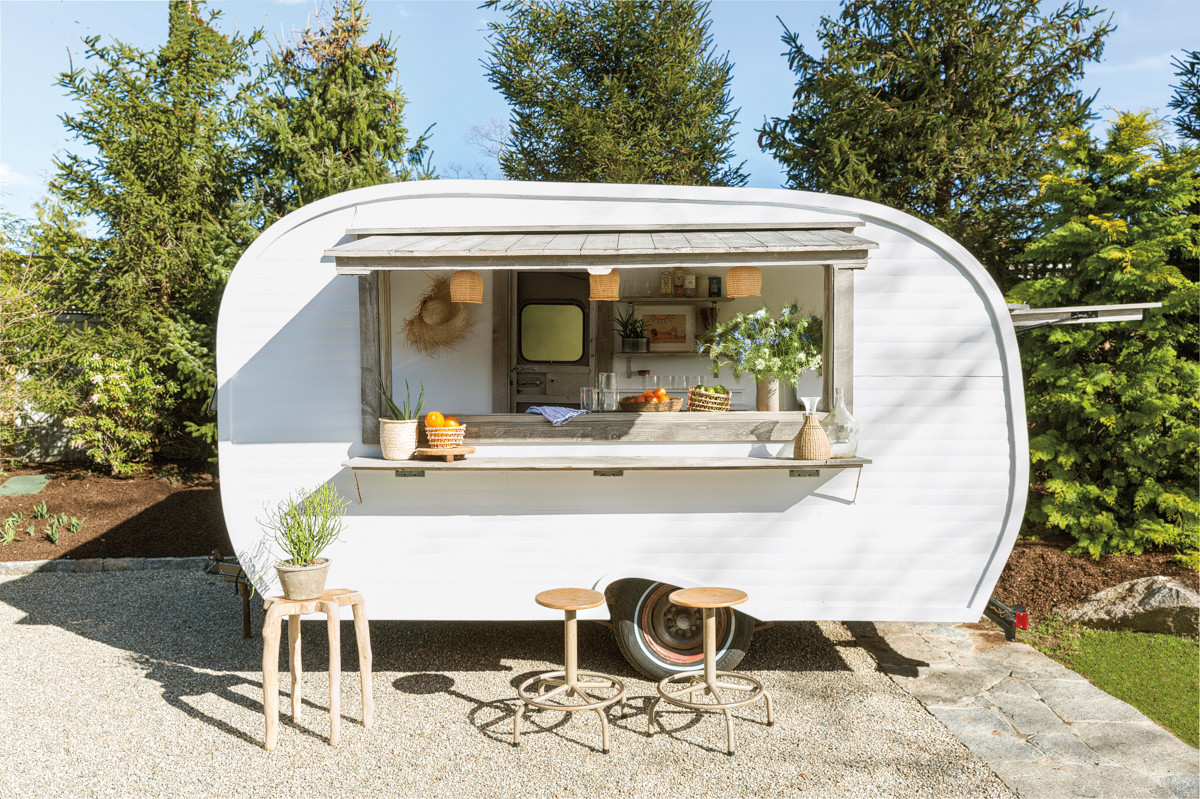 Together, they “took it down to the skin,” ripping out the bed, kitchenette, and stove, then adding windows and cedar shelves for a veritable bar. “The trailer becomes the party,” says Grabe.