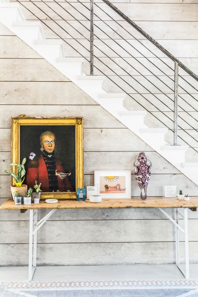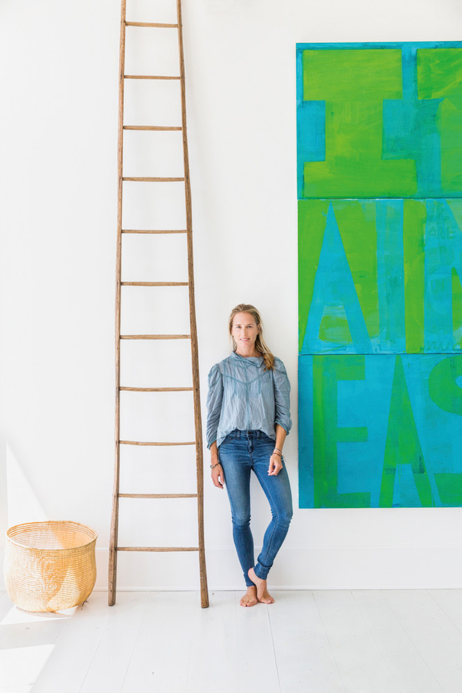 On another wall, a blue and green painting proclaims “It Ain’t Easy.” The apple-picking ladder was a flea market score, and the factory pendant lamps were found at a junk store in Hudson, New York. Throughout, the home is peppered with contemporary art sourced by Sarah Cetrulo, a close friend and the owner of Trove Art Advisory in Darien, Connecticut.