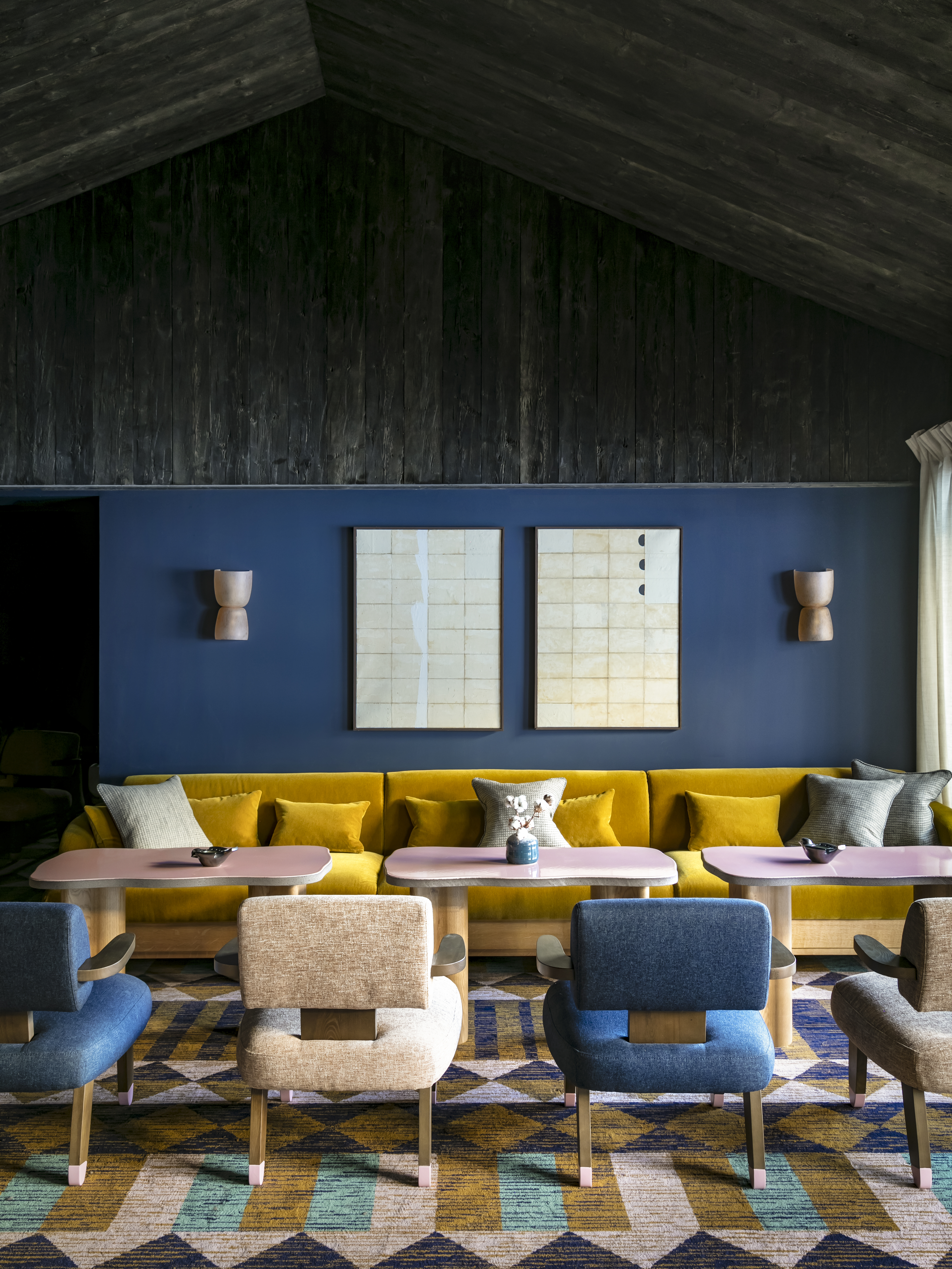 It might seem strange to put two dark colors next to each other, but Yovanovitch proves there can still be contrast as long as the materials are different enough. The grittiness of the stained black planks and smoothness of the blue wall in the hotel’s restaurant take the moodiness of the room up a notch—but thanks to the marigold velvet banquette, not too much.