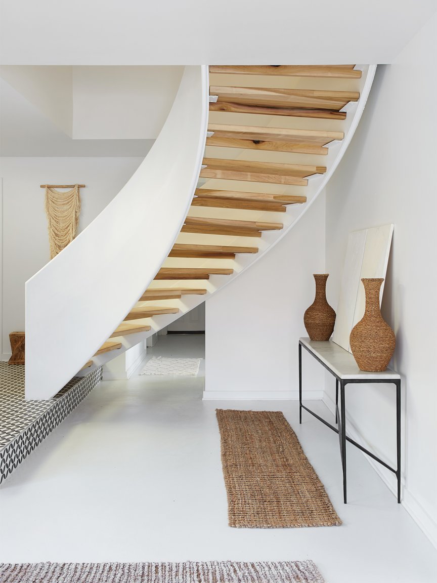 “My friends call me the ‘house whisperer’ because I always try to listen to the house when exploring how to best evolve its style,” says the designer. Ford’s knack for modernizing original features was the perfect plot twist to convert this entryway into a stunning first impression. “The spiral staircase in this midcentury Spanish villa was the architectural highlight of the home, and though we loved it, it was unsafe and totally illegal in 2019,” Ford recalls. They used the shape and layout as inspiration to create an updated version that combined black-and-white tile with a clean, curved stairwell.
