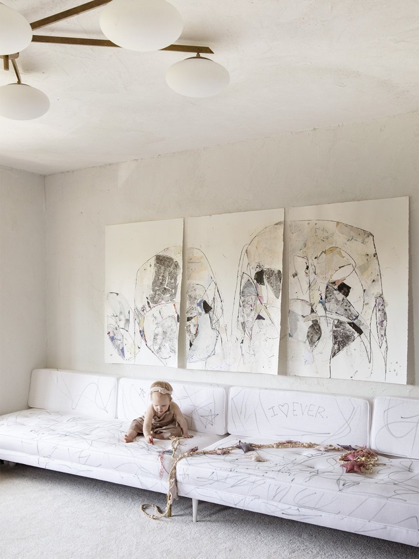 White rooms and kids don’t usually mix, but in Leanne Ford’s Los Angeles house, the two are a recipe for art. Rather than stock daughter Ever’s playroom with easels and construction paper, Ford stuck a crisp linen sofa in there, handed her toddler a crayon, and let her get to work. “I had always pictured it as this evolving thing,” says the designer. The canvas in question is a mid-century couch Ford had re-covered by Pittsburgh-based Blawnox Upholstery before Ever was born. Now swathed in love notes and abstract doodles, the formerly pristine thing is a window into her 1-year-old’s imagination. Here, the designer shares a few ideas for getting your children to channel their inner artist, plus how to make the monochromatic palette last.