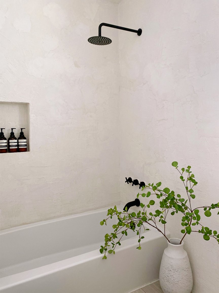 The textured wall treatment has become a signature of Ford’s. The designer first introduced us to the idea when she swathed her dated Los Angeles bathroom in the concrete coating (she applied it right on top of the old wall tile!). She has also been known to use it in husband Erik Allen Ford’s Buck Mason stores, one of which Prochaska visited while on a trip to L.A. “When I saw it in real life, I knew I could do it,” she says. As soon as she got back home, she followed through and transformed her kids’ builder-grade bathroom into a zen retreat (check out her full how-to here). Ahead, she shares what she learned from putting the pro’s famous method to the test.