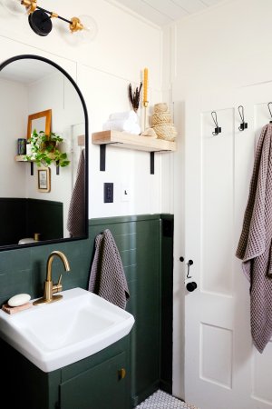 When Prochaska and her family moved into their home six years ago, she could tell it was newly renovated—and not in a good way but in the everything was from Home Depot way. She wanted to pare the whole space back, so she replaced the old all-in-one tub-shower with a new alcove bath. The rest of the walls were framed with waterproofing membrane, installed by a professional. She even removed the trim work around the window to keep the wall surfaces looking as sleek as possible.
