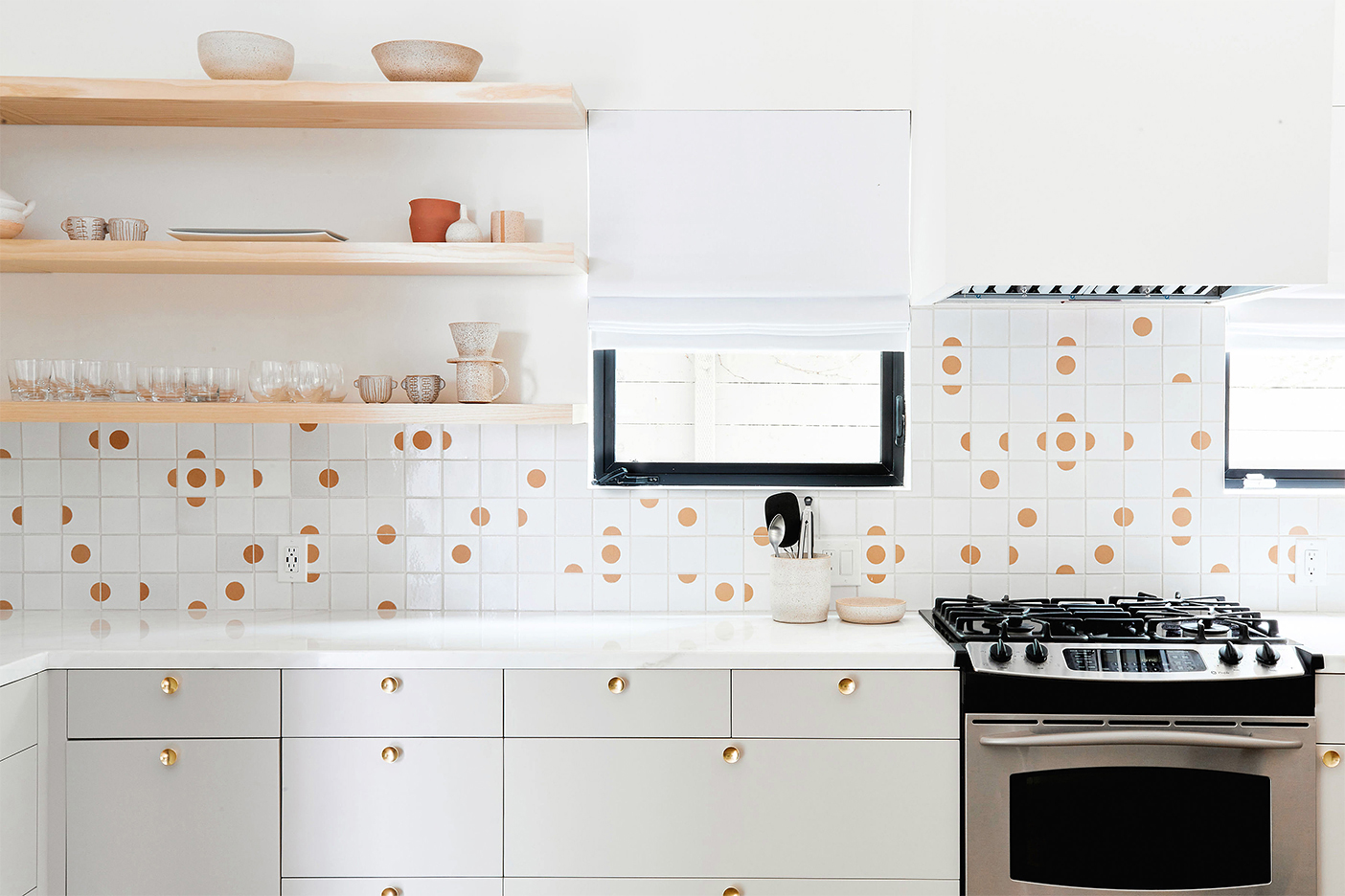 But the color is also a great supporting star. “We were able to save a lot of money by sticking with the existing cupboards,” says designer Natalie Myers of her Venice Beach, California, kitchen makeover. She had these flat fronts sprayed the subtlest gray shade at the paint shop, then swapped in a new tone-on-tone countertop to help them blend in even more. This way all eyes are on the dotted tile backsplash.