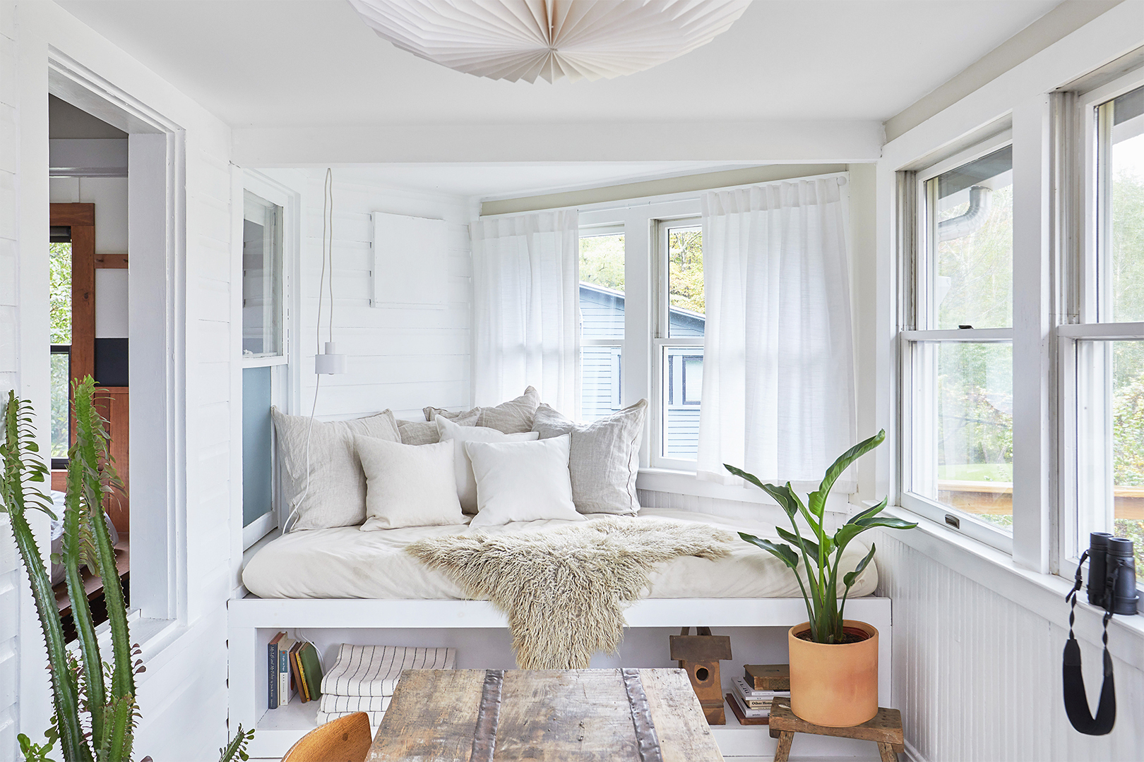 In order to hit the sweet spot between homey and hotel-like, Espeseth avoided big-box retailers where she could, instead scouring local vintage shops and online marketplaces. She looked for pieces with built-in patina that would instantly add warmth and character, like the enveloping mid-century leather armchair now in the living room and the reclaimed wood shelving for the kitchen. “A lot of people think that a rental house should just be very bare bones,” says Phan. “But that’s not an engaging guest experience.” When it was finally time for the couple (and their crew of friends) to move out when the renovation was finished, it was like the last day of a very draining sleepaway camp.
