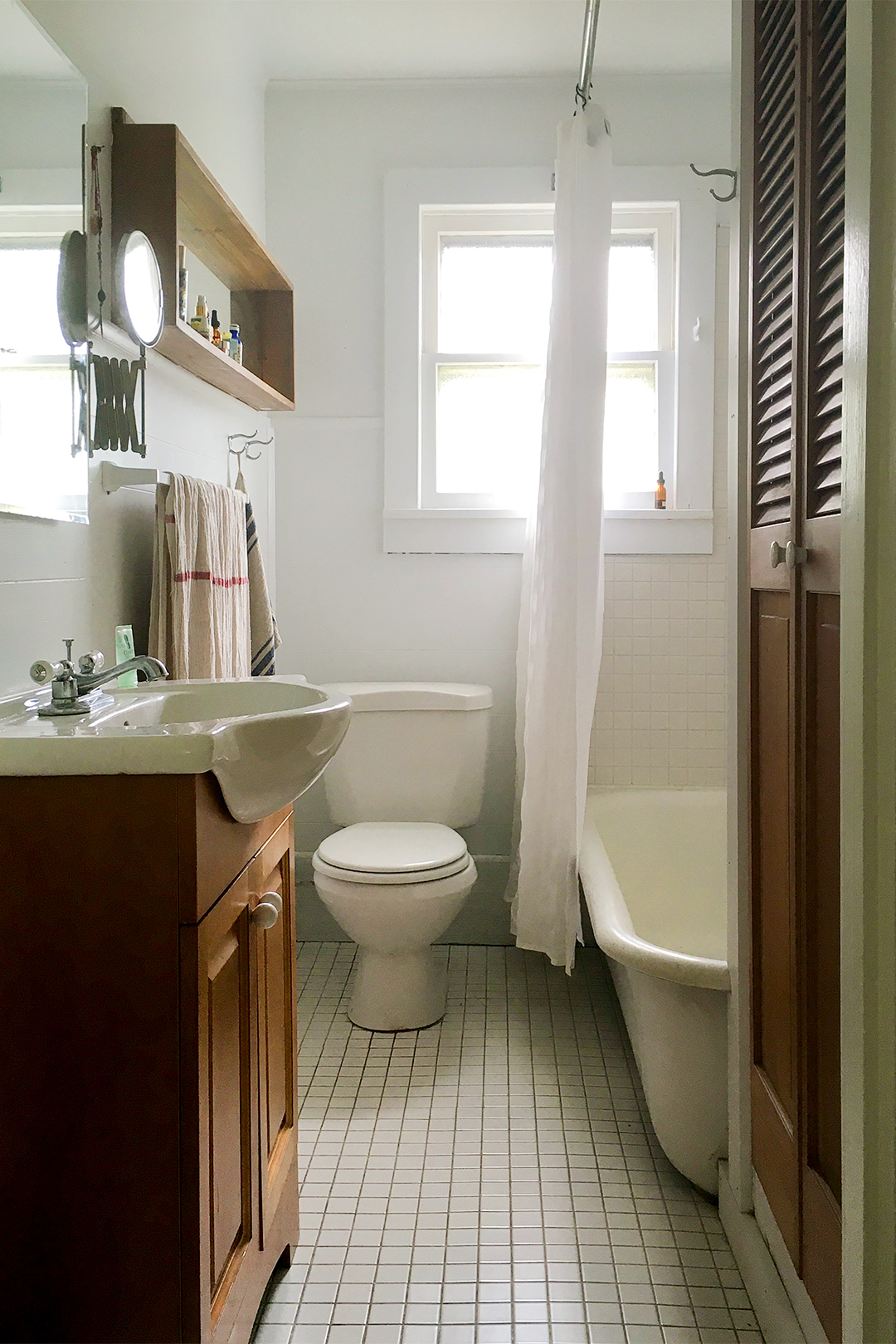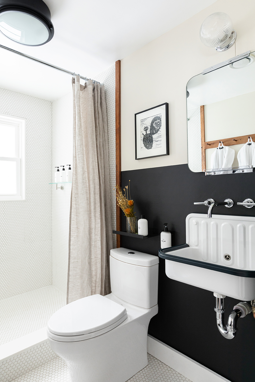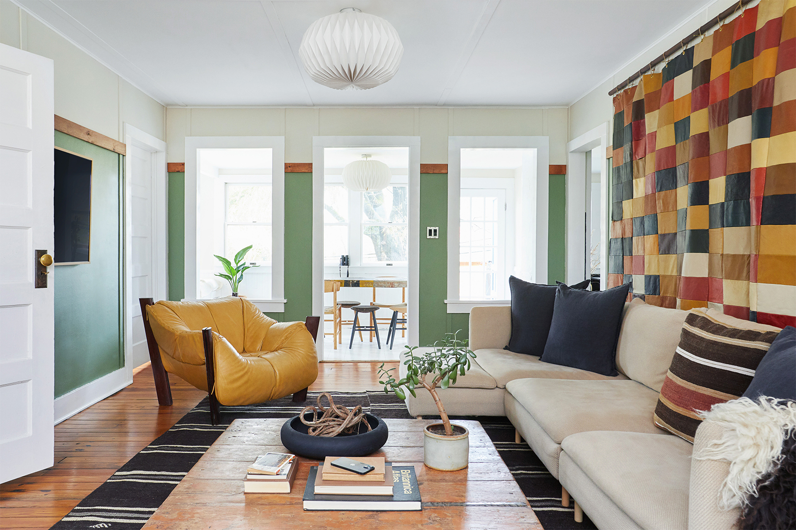 Throughout the house, paint only shows up on the bottom halves of walls: green in the living room, navy in the kitchen, and black in the bathroom. The division acts as an optical illusion—when the darker hues are paired with white on top, it brightens each room and makes the 8-foot-high ceilings appear taller. Plus it takes advantage of the small (yet plentiful) windows, reflecting the natural light.