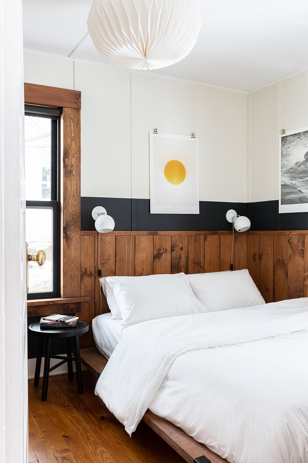 In the primary bedroom, previously painted a jarring stark white, Espeseth leaned into the cabin’s woodsy surroundings and actually installed (rather than took down) ’60s-style wood paneling on the lower half of the walls. Stained the same shade as the custom bed frame, the finished look has the effect of a cozy built-in, not a time warp. “We did it because it was cost-effective, but it also helps the space feel more intentional,” explains Espeseth.