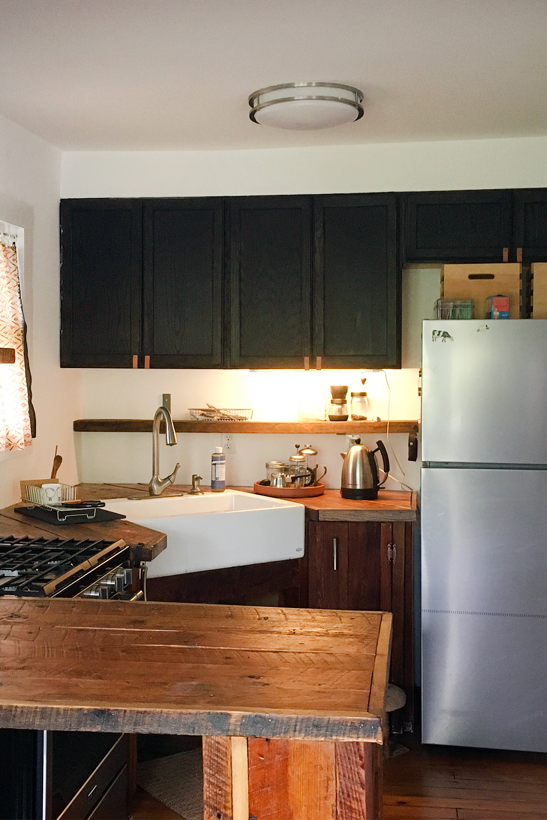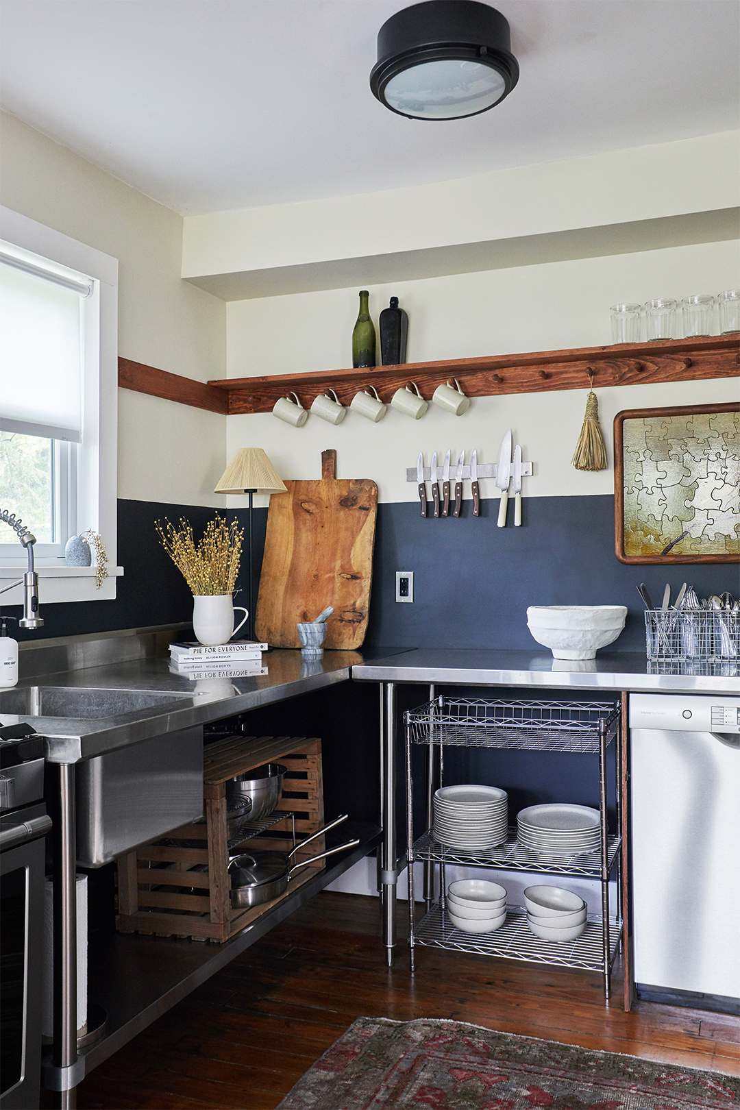 In the kitchen, inexpensive stainless steel prep tables (like those in the back of your favorite restaurants) take the place of traditional lower cabinets. (The room was previously packed full of nonfunctional lower storage and black cabinetry.) Other than being super-durable and easy to clean, the pieces streamline the once cramped space without requiring any construction. The original upper cabinets got the ax as well, replaced by airy open shelving.