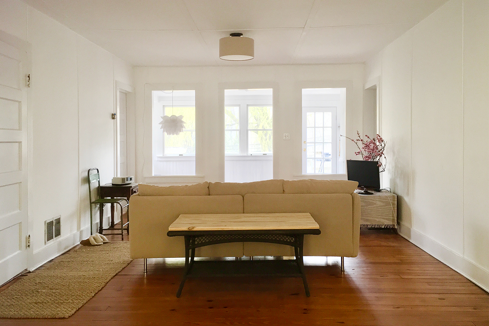 Enlisting their friends was the first step in upgrading that secondary space; Espeseth and Phan decided to save money on labor in order to splurge on infusing personality into the project elsewhere, like with the statement quilt tapestry in the living room. “You have to decorate a rental like you’re decorating it for yourself; you can’t worry about preciousness,” says Espeseth. A few very generous pals moved in for the summer, assisting with everything from demo to paint to appliance installation—the delivery drivers observed the place looked like a commune.